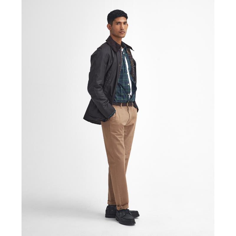 The Barbour Ashby Mens Waxed Jacket is a modern take on the classic Bedale jacket. It is designed with 6 oz Sylkoil waxed cotton, which has a matte finish and a cosy, worn-in feel. Classic features include a storm fly front with sturdy stud fastenings, a sophisticated sit-down cord collar with throat strap, angled handwarmer pockets, and two roomy bellow pockets. This jacket is slightly more fitted than the Bedale while still giving room for necessary winter layering. Lined with Barbours classic tartan cotton lining.