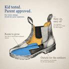 The Blundstone 565 Kids Unisex Boots provide premium water-resistant leather and a contoured EVA footbed for ultimate comfort and breathability. With a lightweight and abrasion-resistant outsole and steel shank, these boots are a rugged all-rounder that are easy to slip on and off. The timeless chelsea boot design adds style to functionality.
