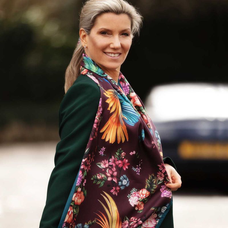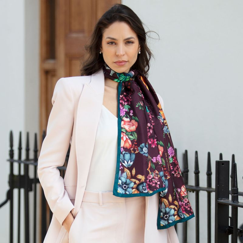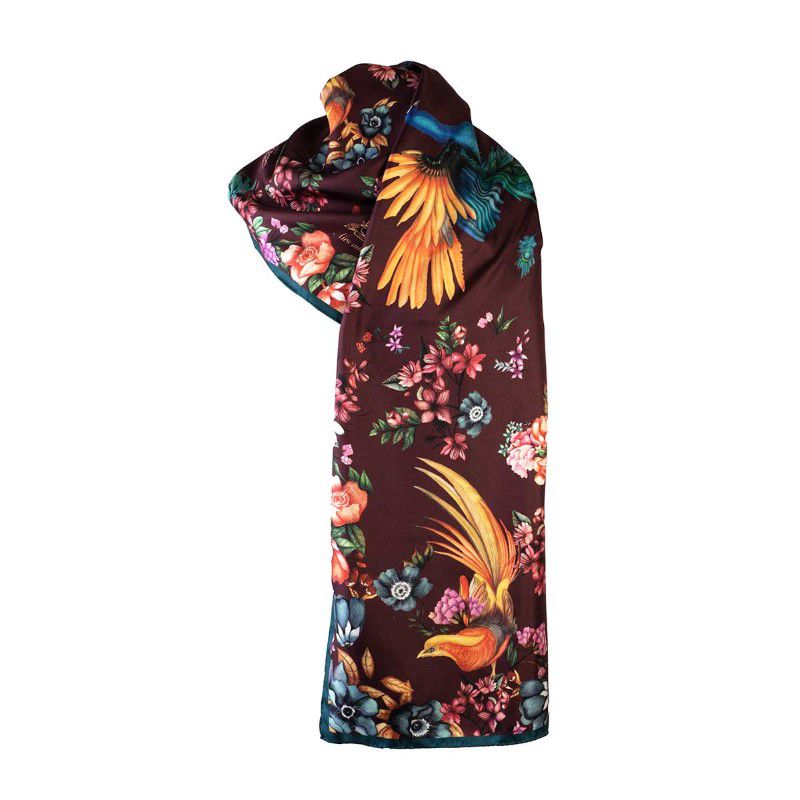 The Airs & Graces Classic Scarf from Clare Haggas is crafted from 100% silk twill, made in England, and hand finished with exceptional attention to detail. Featuring a beautiful Japanese-inspired floral design with stunning oriental birds, the colour palette is so rich and delightful it is sure to make any outfit pop. The rectangular shape is easy to style and can be worn in a variety of ways, draped over the shoulders or wrapped around the neck. Brighten up your day with this charming scarf... more than just an accessory, it's wearable art!