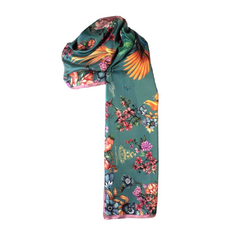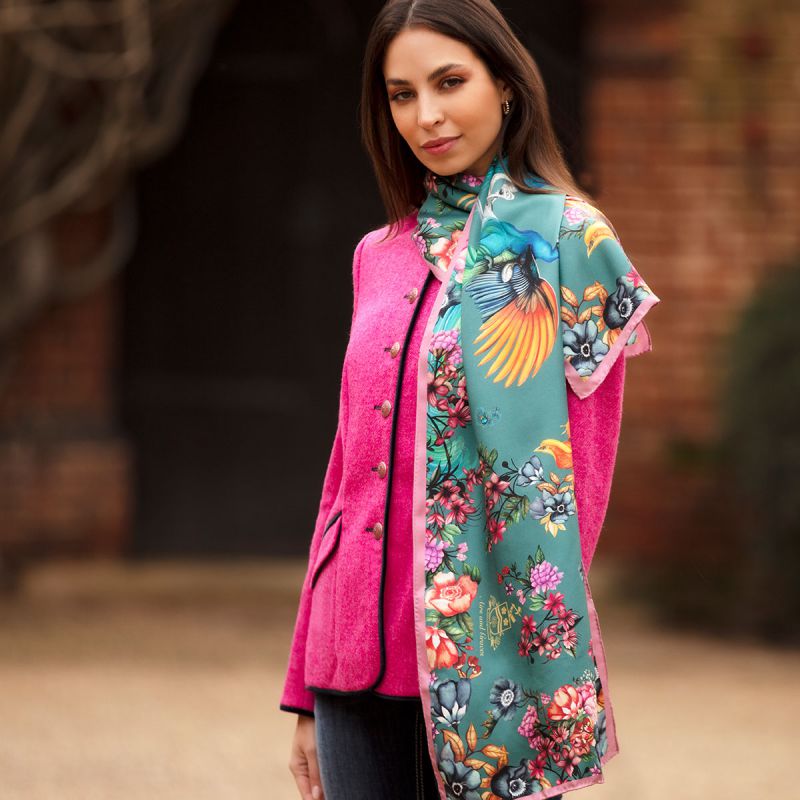 The Airs & Graces Classic Scarf from Clare Haggas is crafted from 100% silk twill, made in England, and hand finished with exceptional attention to detail. Featuring a beautiful Japanese-inspired floral design with stunning oriental birds, the colour palette is so rich and delightful it is sure to make any outfit pop. The rectangular shape is easy to style and can be worn in a variety of ways, draped over the shoulders or wrapped around the neck. Brighten up your day with this charming scarf... more than just an accessory, it's wearable art!