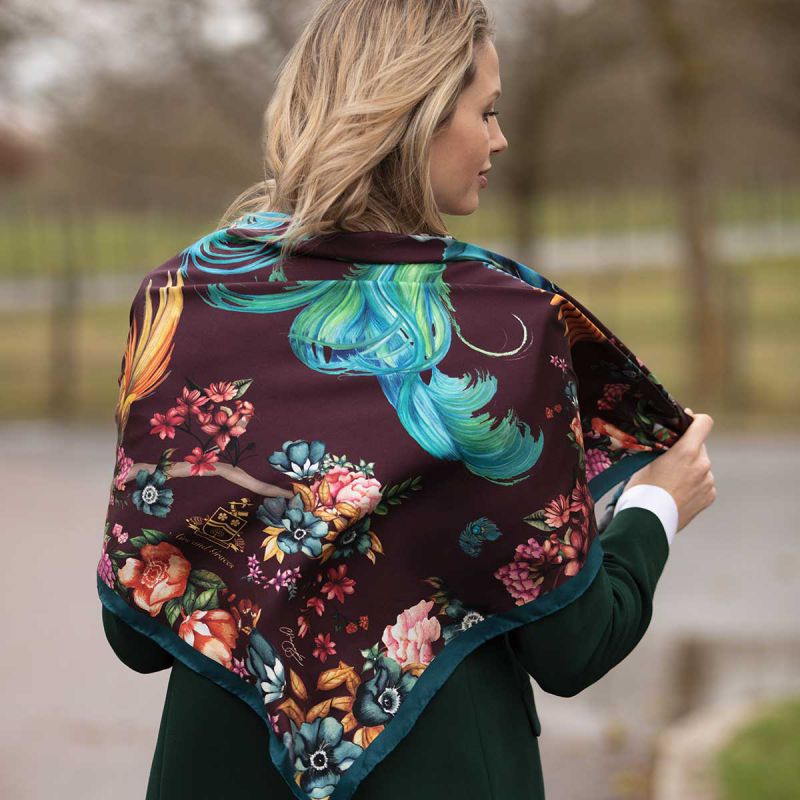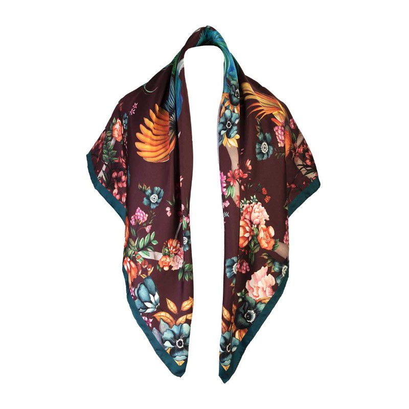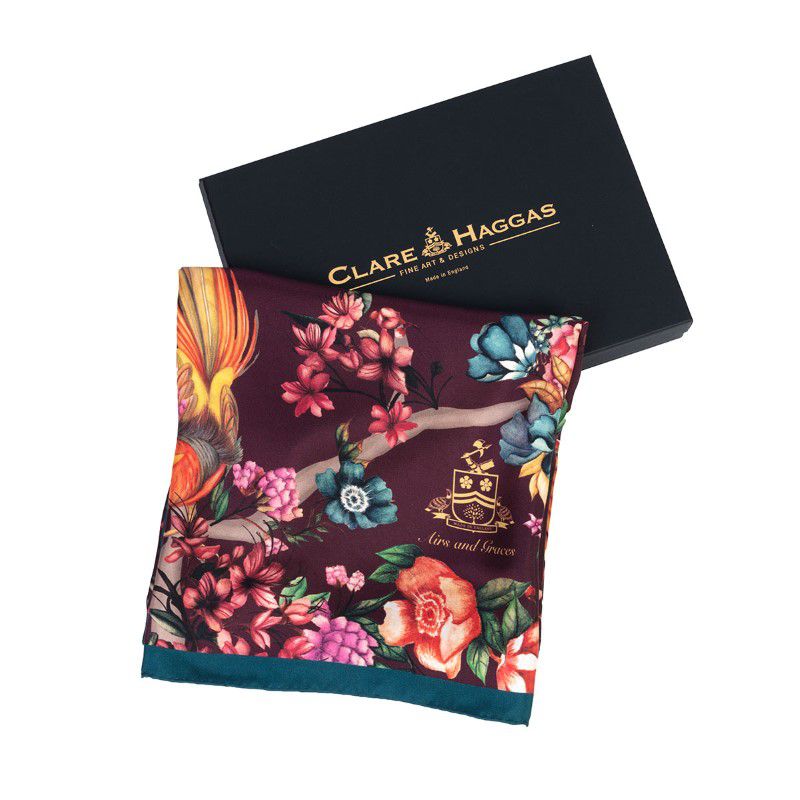 The Clare Haggas Airs & Graces Large Silk Scarf is crafted from 100% silk twill, made in England and hand finished with exceptional attention to detail. Featuring a beautiful Japanese-inspired floral design with stunning oriental birds, the colour palette is so rich and delightful it is sure to make any outfit pop. The large square shape is easy to style and can be worn in a variety of ways. Brighten up your day with this charming scarf... more than just an accessory, it's wearable art!
