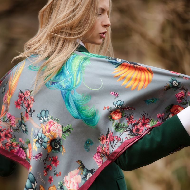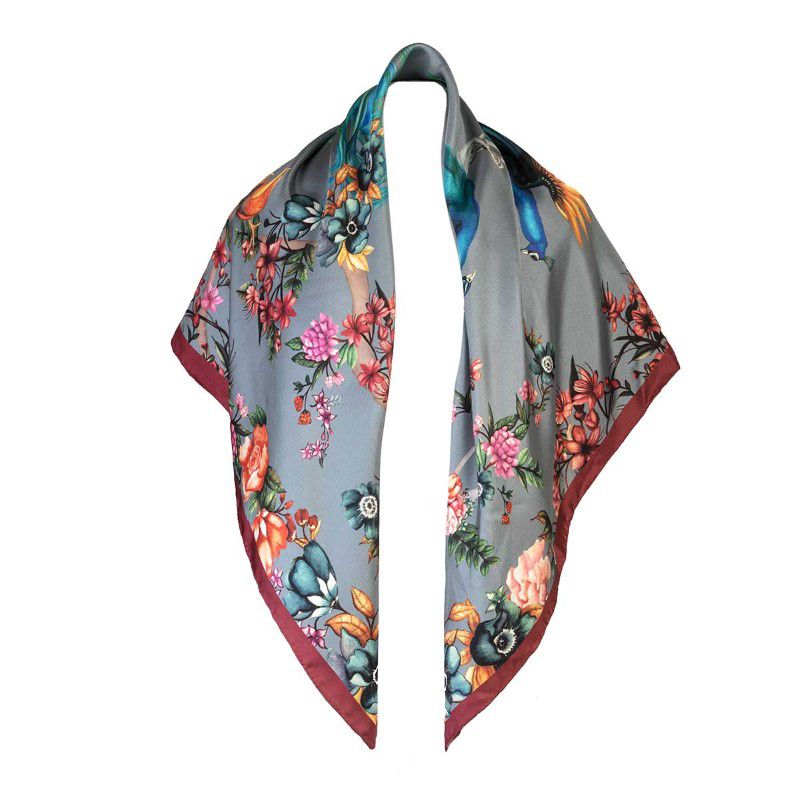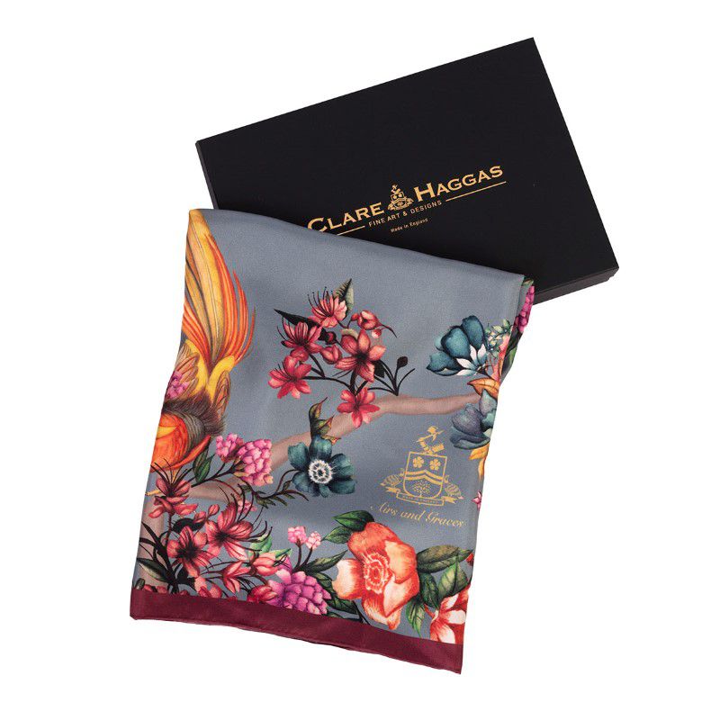 The Clare Haggas Airs & Graces Large Silk Scarf is crafted from 100% silk twill, made in England and hand finished with exceptional attention to detail. Featuring a beautiful Japanese-inspired floral design with stunning oriental birds, the colour palette is so rich and delightful it is sure to make any outfit pop. The large square shape is easy to style and can be worn in a variety of ways. Brighten up your day with this charming scarf... more than just an accessory, it's wearable art!