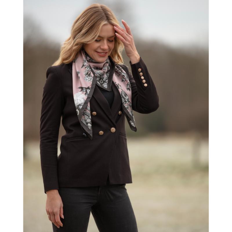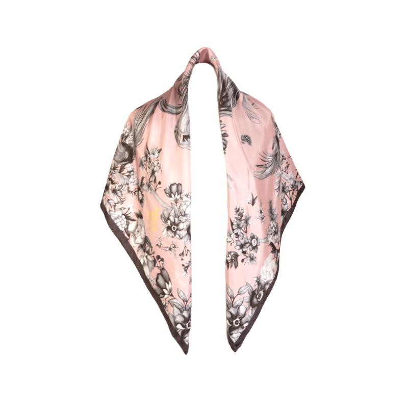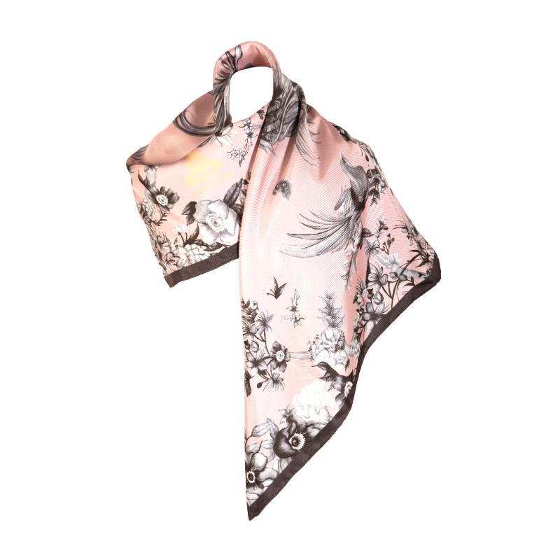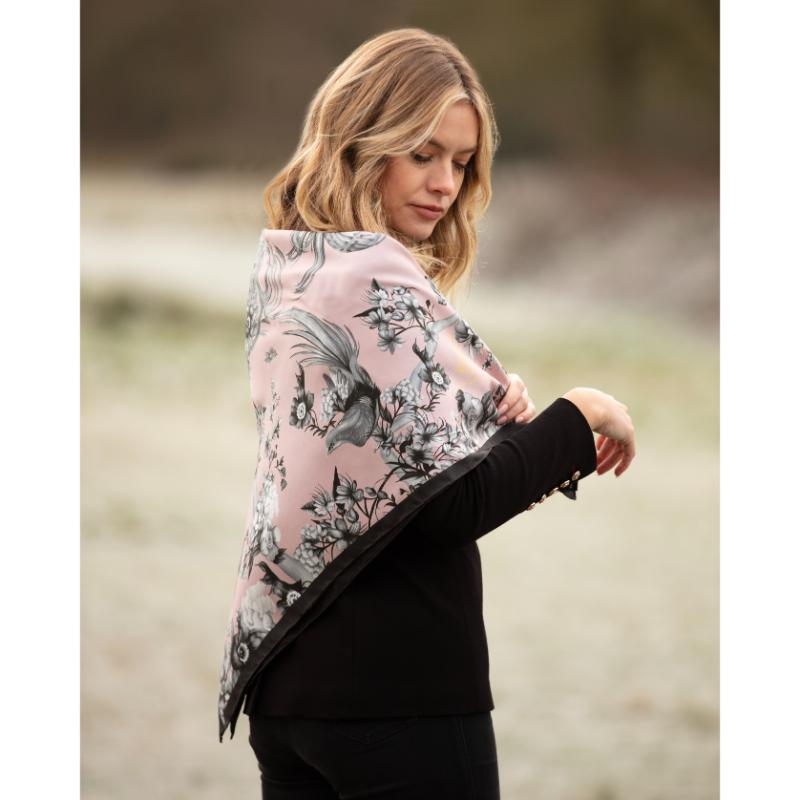 The Clare Haggas Airs & Graces Monochrome Large Square Silk Scarf artfully combines traditional Chinoiserie influences with detailed wildlife and botanical illustrations. Featuring cherry blossoms, lotus flowers, the Chinese pheasant Charlie, and majestic peacocks, this design symbolises renewal and strength. The monochrome palette enhances the intricate artwork’s fine details, while the Pearl Pink background adds a fresh, vibrant touch. Crafted in a generous large square size, this silk scarf offers a luxurious accessory that elevates any ensemble with cultural depth and refined elegance.