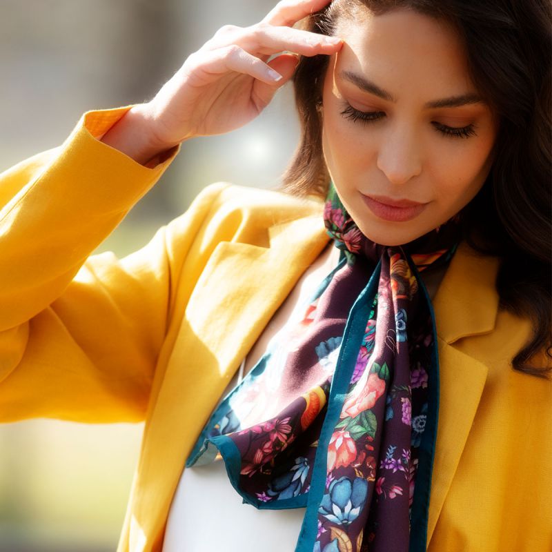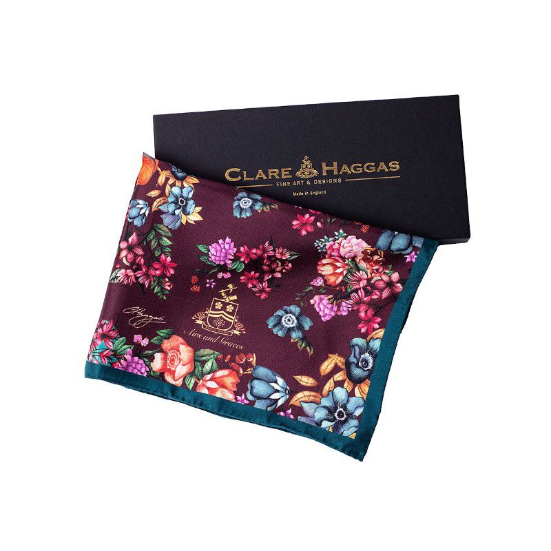 The Airs & Graces Narrow Scarf from Clare Haggas is crafted from 100% silk twill, made in England, and hand-finished with exceptional attention to detail. Featuring a beautiful Japanese-inspired floral design with stunning oriental birds, the colour palette is so rich and delightful it is sure to make any outfit pop. The rectangular shape is easy to style and can be worn in a variety of ways, draped over the shoulders or wrapped around the neck. Brighten up your day with this charming scarf... more than just an accessory, it's wearable art!
