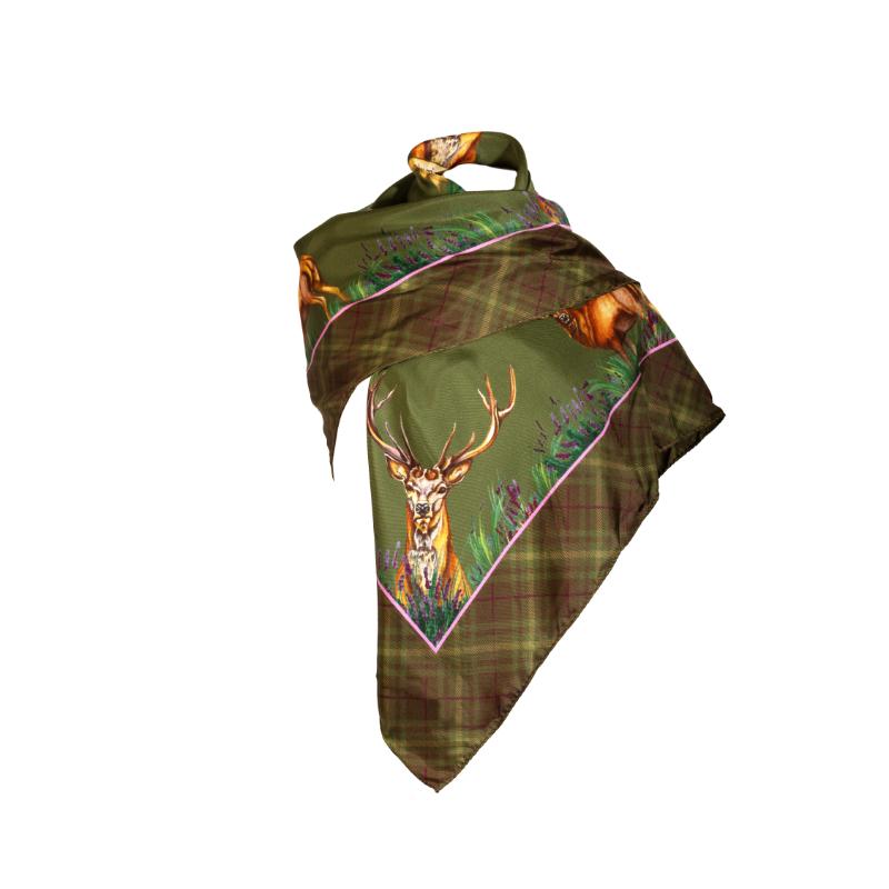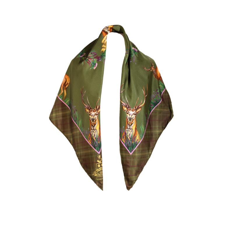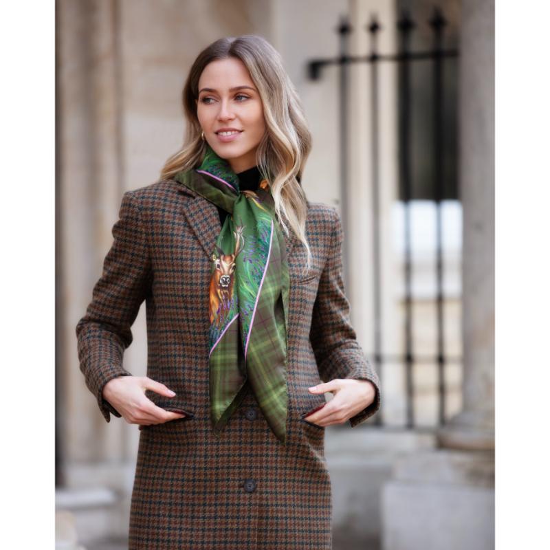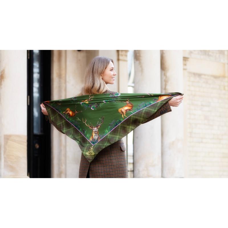 The Clare Haggas Caledonia Classic Pure Silk Scarf captures the wild beauty of Scotland’s Highlands with striking imagery of two majestic stags. Measuring 153cm by 43cm, this scarf features intricate tartan borders that complement the central design, symbolising strength, independence, and the enduring spirit of the region. Crafted from pure silk, it offers a luxurious feel and vibrant colour, making it a distinguished statement piece. This design is a heartfelt tribute to Scotland’s natural grandeur, blending artistry and heritage in a timeless accessory.