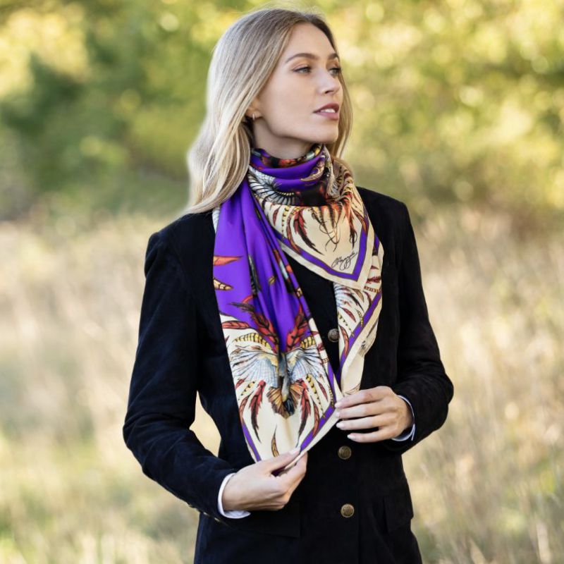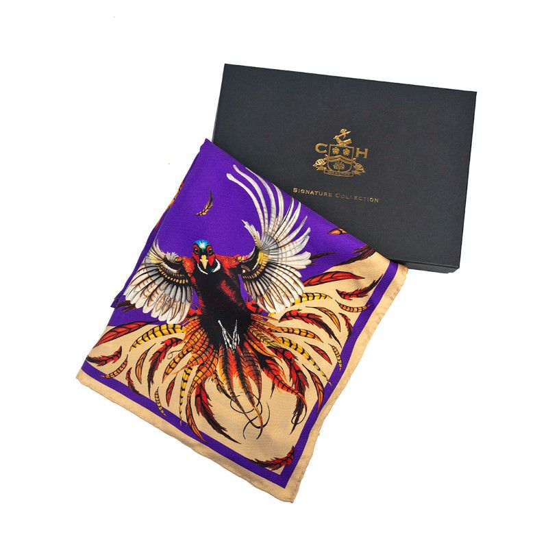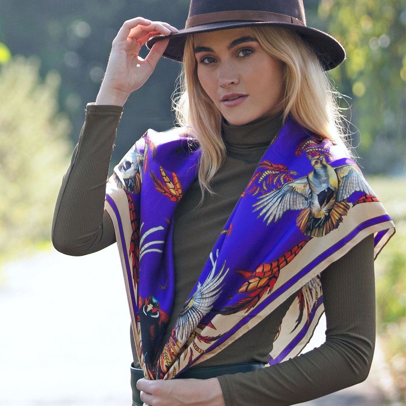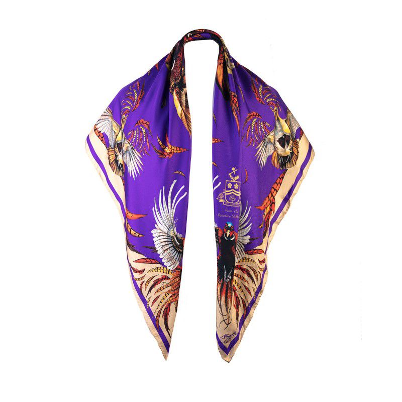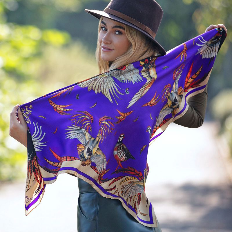 The spectacular Game On Large Silk Scarf by Clare Haggas features a charming gamebird design incorporating majestic pheasants, grey and French partridges, and the elusive black grouse, all set on a rich vibrant background with a flowing feather border. Crafted in England from the finest silk twill and hand finished to the most exquisite level of detail. The large square shape makes styling this scarf easy, pairing it with a variety of outfits whatever the occasion. Packaged in a beautiful presentation box, this scarf would make an incredible gift or an indulgent accessory for yourself.
