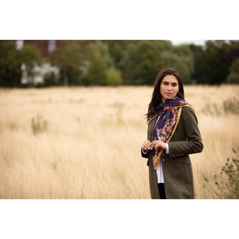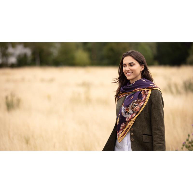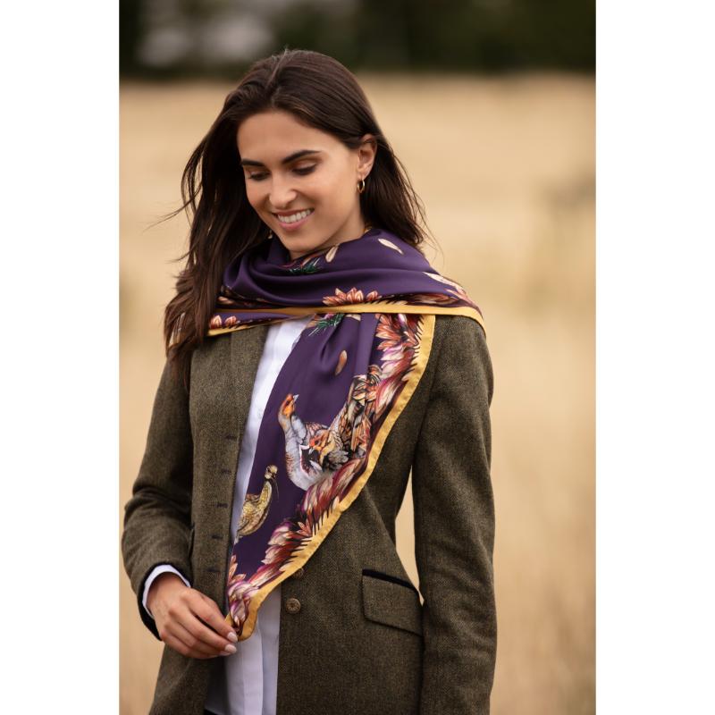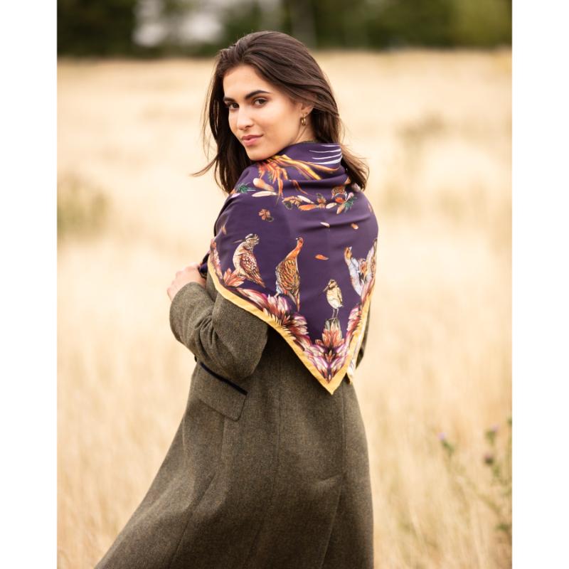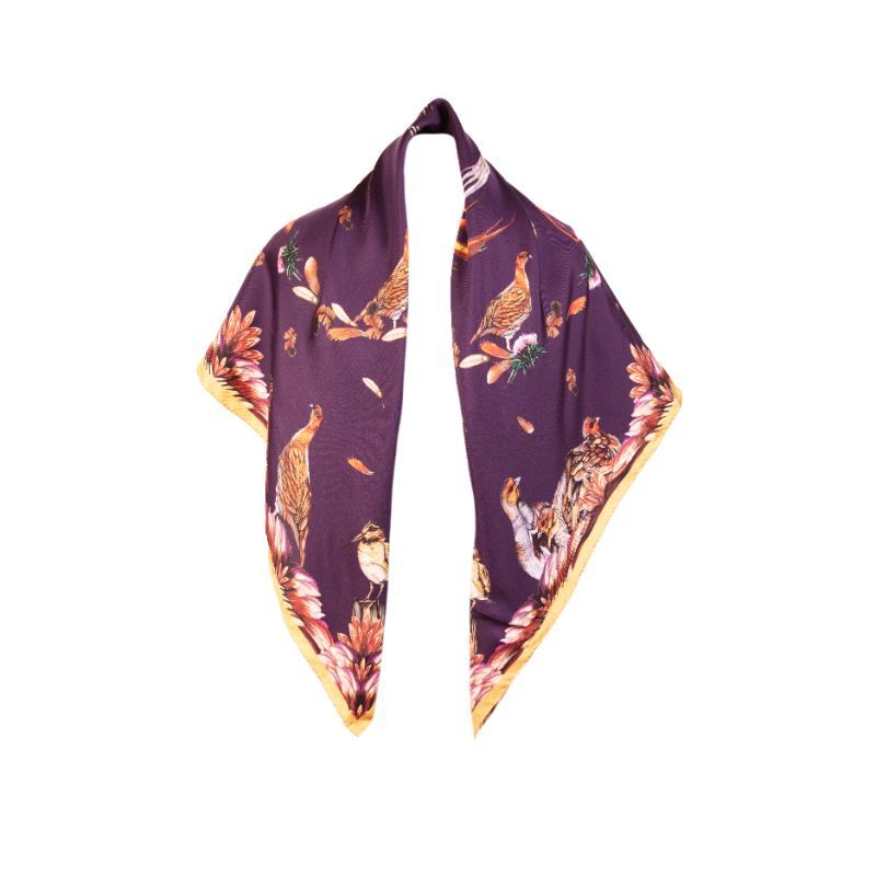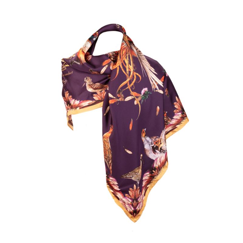 Clare Haggas Grouse Misconduct Large Square Silk Scarf - Aubergine & Gold