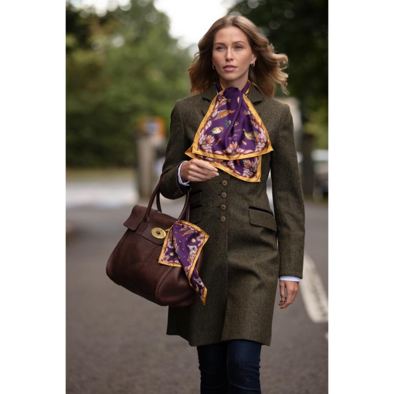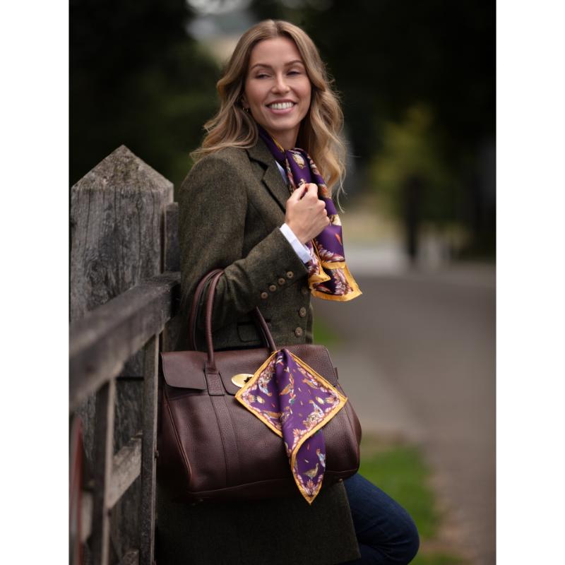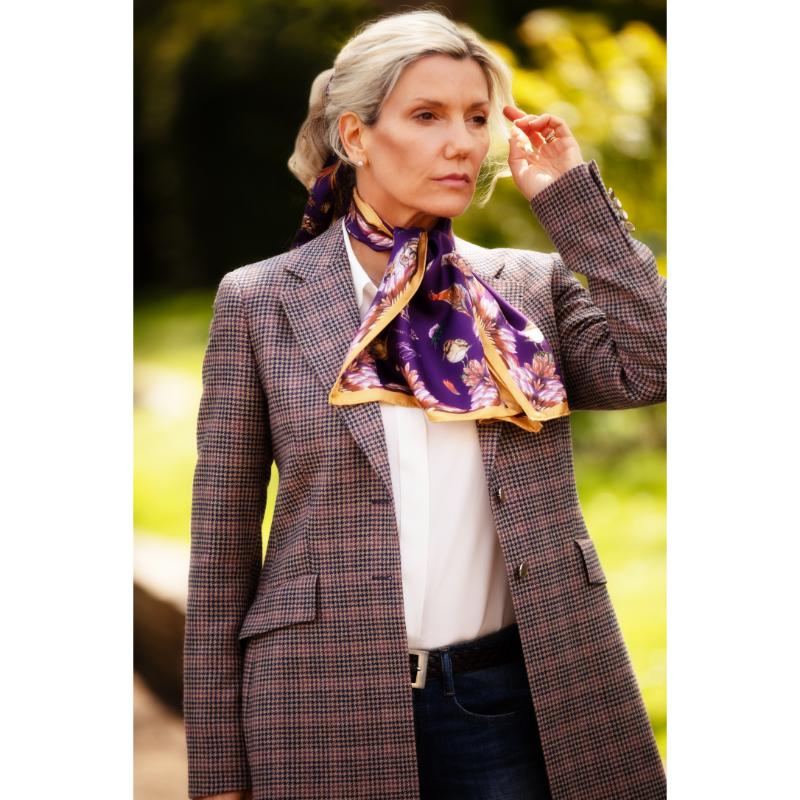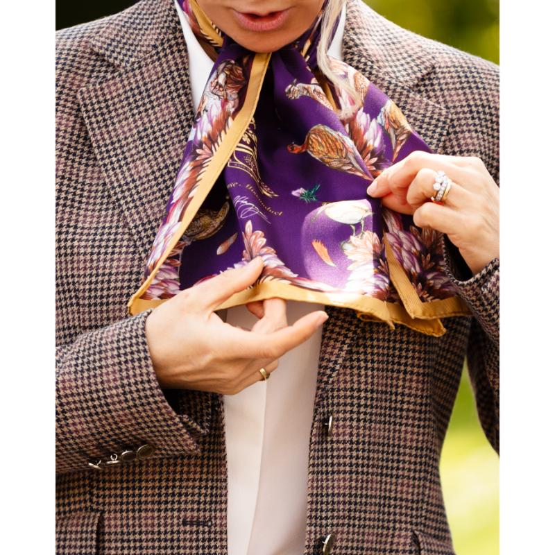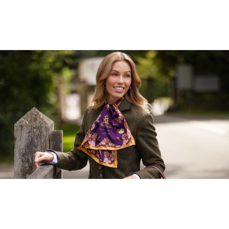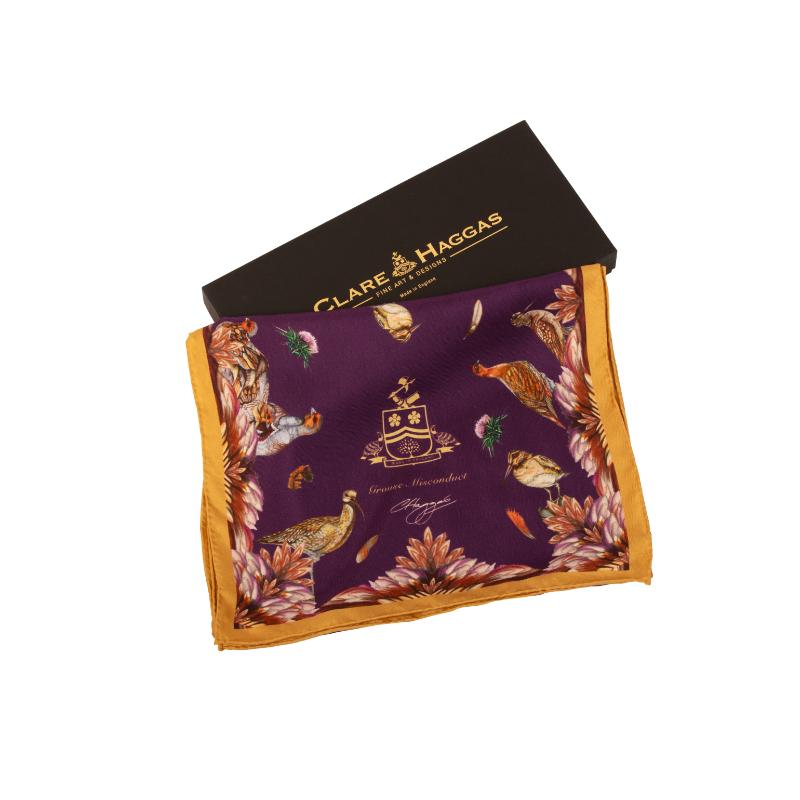 The Clare Haggas Grouse Misconduct Narrow Silk Scarf offers a bold tribute to English heritage and the shooting season. Featuring Clare Haggas’ original artwork, the design vividly captures the regal red grouse against the rugged moorland backdrop. This large square silk scarf combines tradition with a rebellious spirit, making it a striking accessory that honours the Glorious Twelfth and the untamed beauty of the English countryside. Perfect for those who appreciate heritage with a contemporary edge.