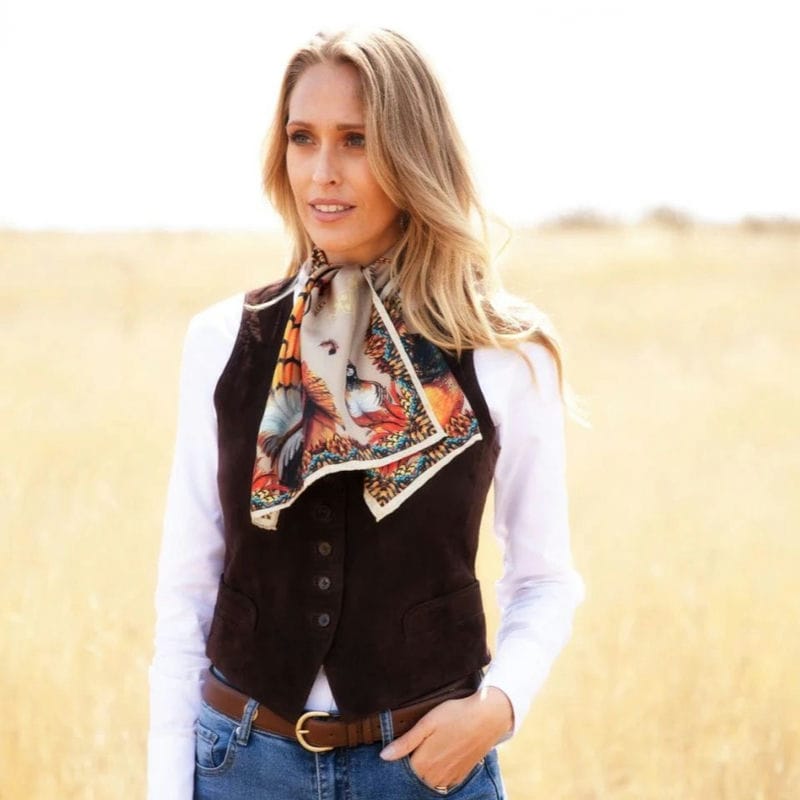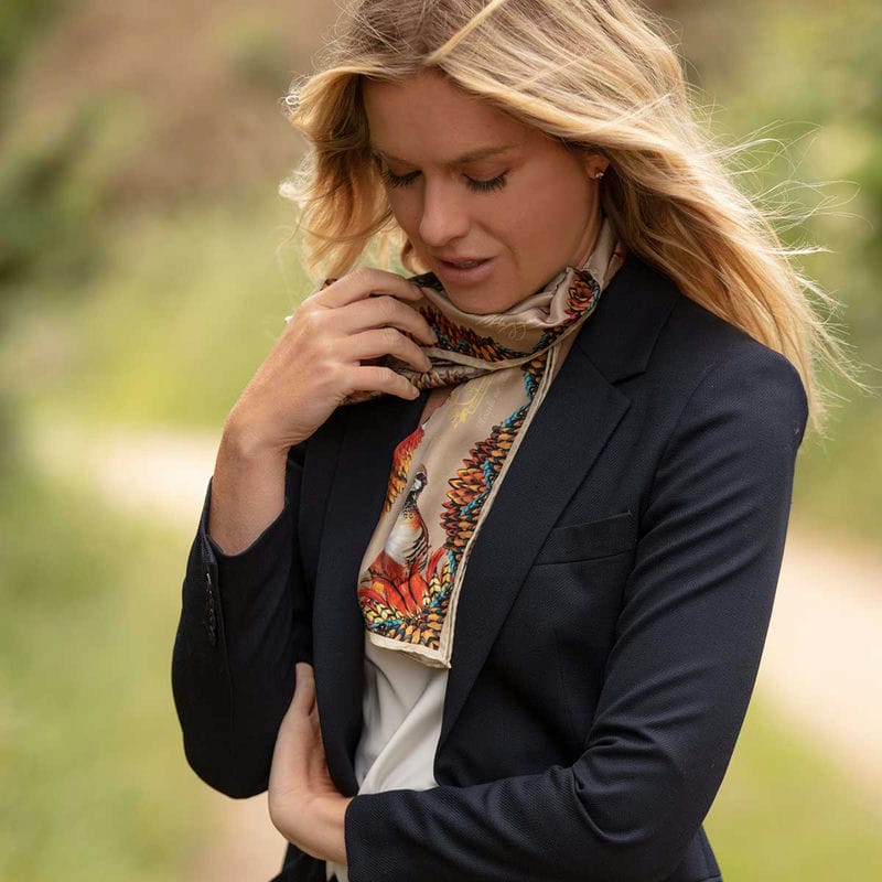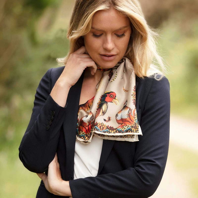 The Clare Haggas Heads or Tails Narrow Twill Silk Scarf is crafted in England using the finest 100% pure silk twill with hand rolled edges. Featuring majestic cock pheasants with their flamboyant plumage, the rather dignified French partridge, and a glorious feather border, all displayed on a vibrant background, Heads or Tails makes a beautiful, lively design. The rich colour palette and luxurious depth of detail makes this scarf suitable for all occasions, whether you're dressing up or aiming for casual country style.