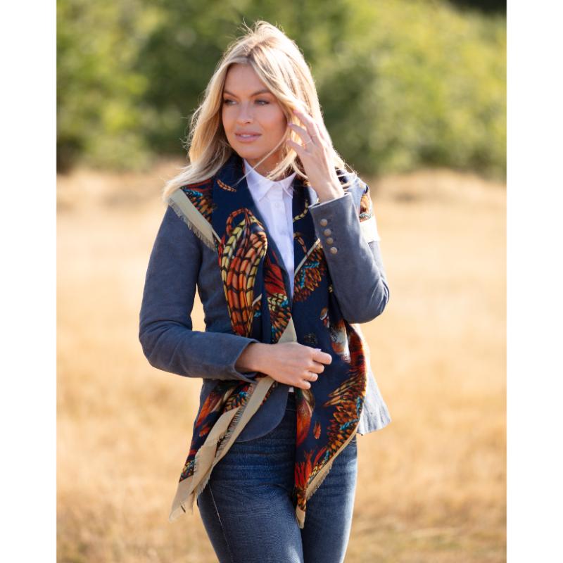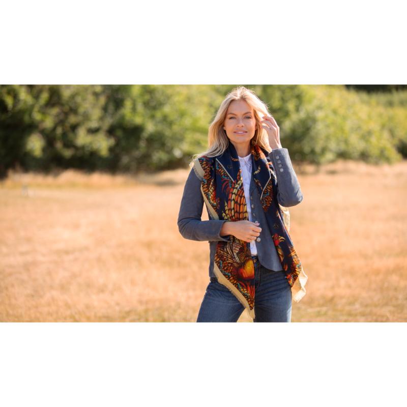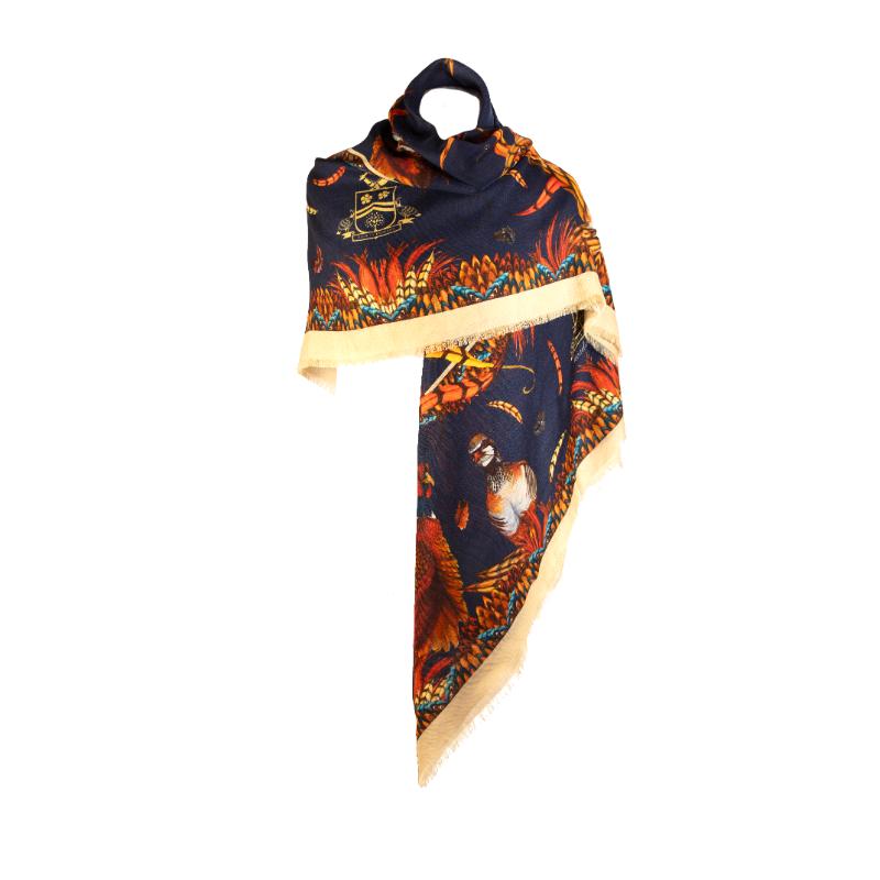 The Clare Haggas Heads or Tails Wool Silk Shawl Scarf features vibrant game bird motifs that bring a lively, sophisticated touch to any outfit. Known affectionately as Bruce and Friends, this design replaces the beloved George collection, offering a fresh and exclusive look each season. Crafted from luxurious silk, it provides a versatile accessory perfect for countryside outings, city wear, or professional settings, ensuring you stand out with elegance and originality.
