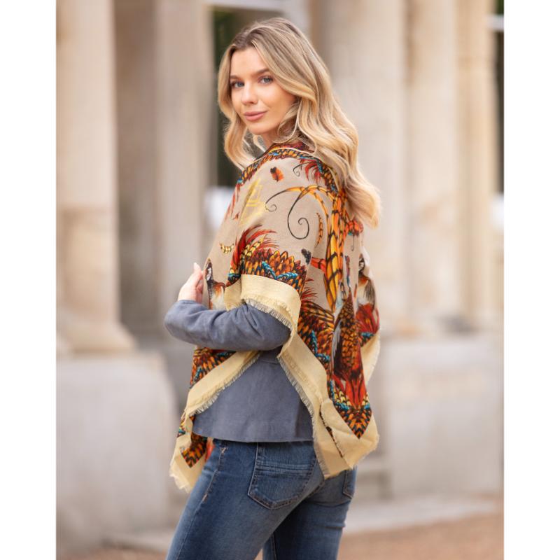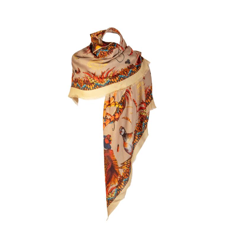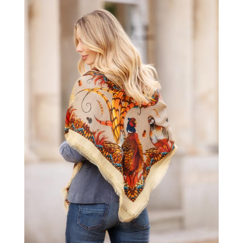 The Clare Haggas Heads or Tails Wool Silk Shawl Scarf features vibrant game bird motifs that bring a lively, sophisticated touch to any outfit. Known affectionately as Bruce and Friends, this design replaces the beloved George collection, offering a fresh and exclusive look each season. Crafted from luxurious silk, it provides a versatile accessory perfect for countryside outings, city wear, or professional settings, ensuring you stand out with elegance and originality.