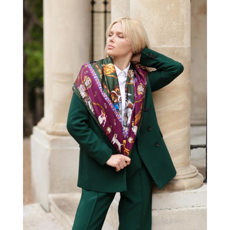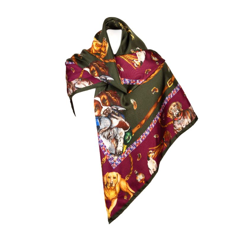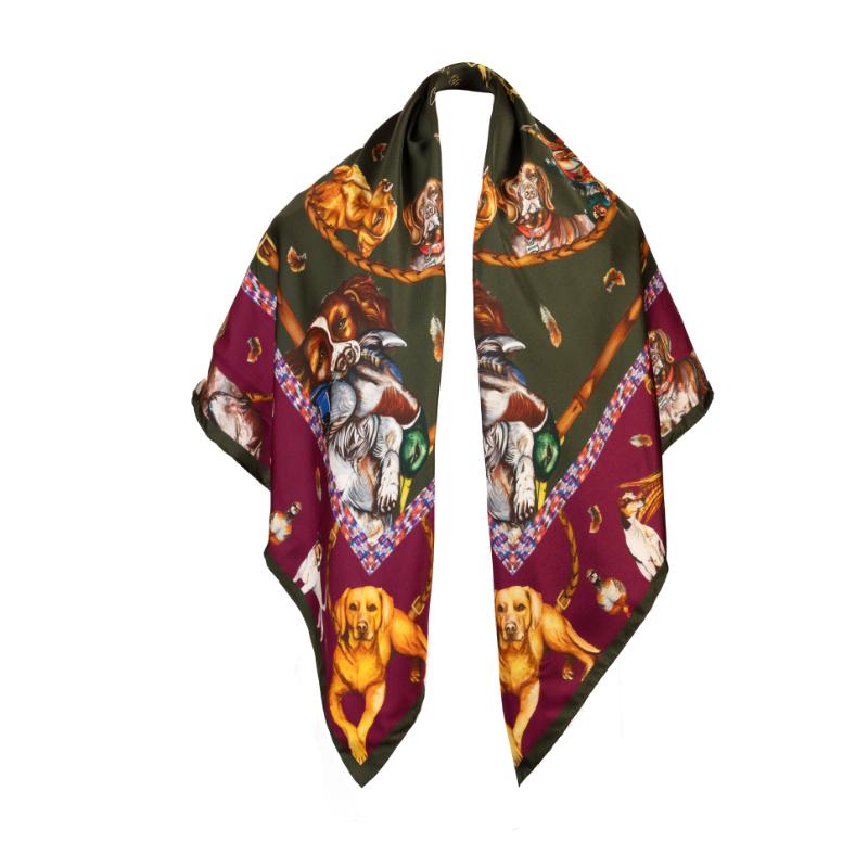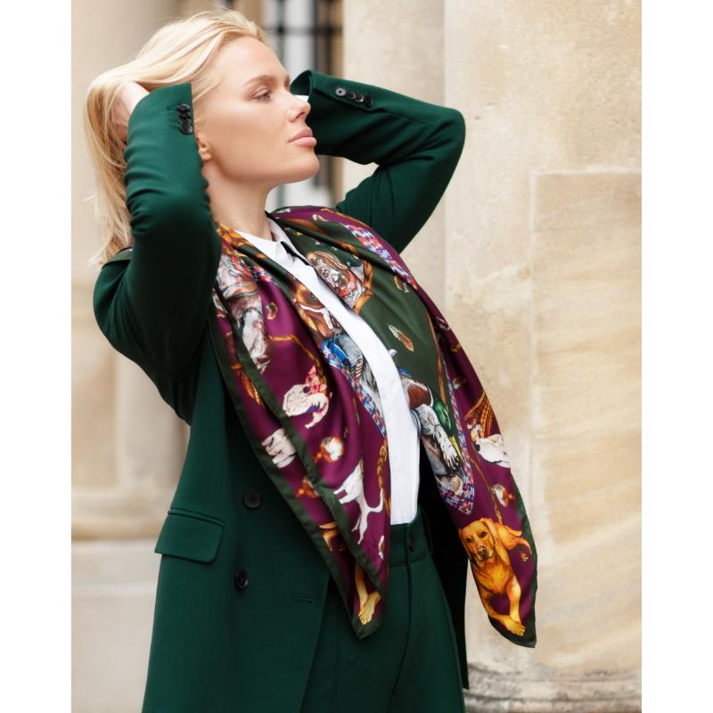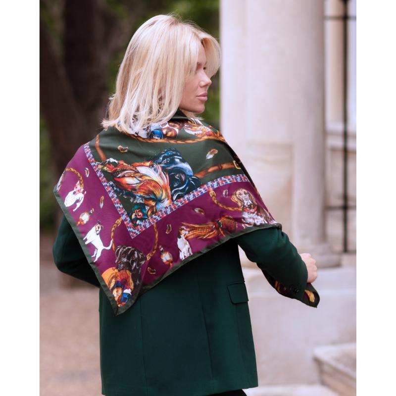 Clare Haggas It's A Dogs Life Large Square Silk Scarf - Hunter Green & Oxblood Red