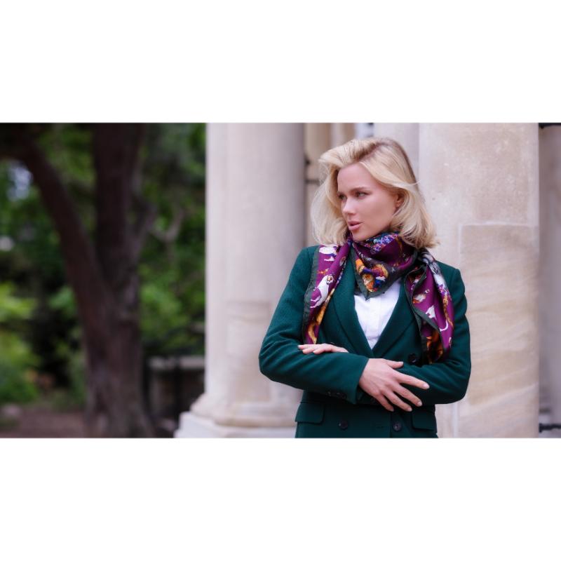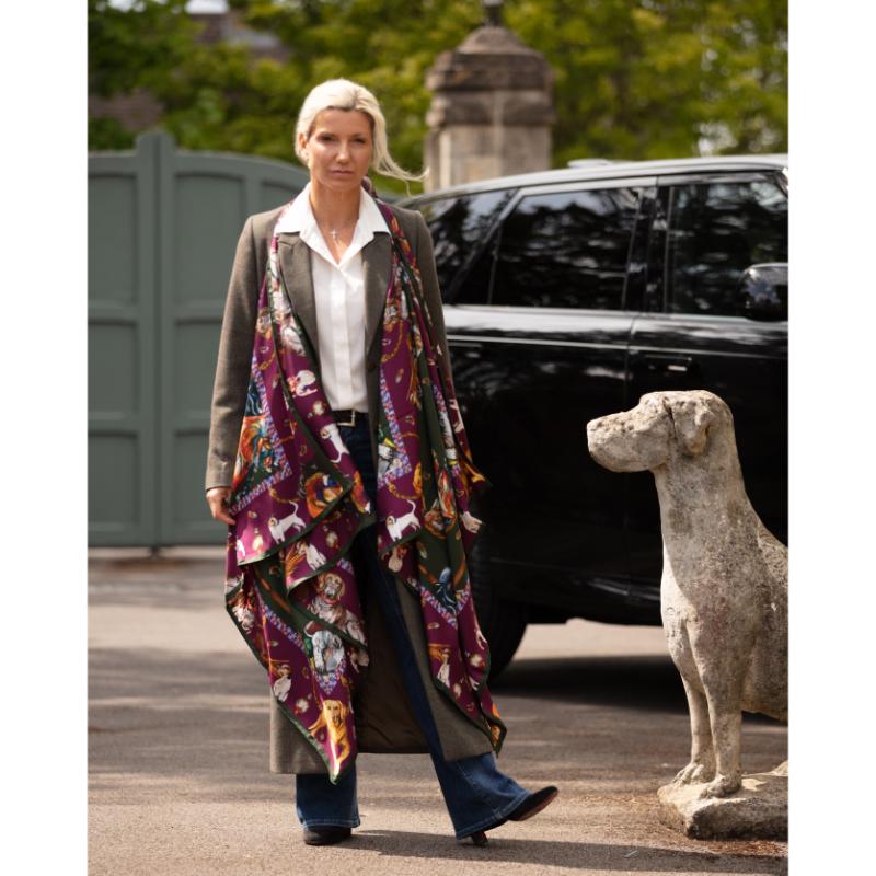 The "It’s a Dog’s Life" Large Square Silk Scarf celebrates the spirit of versatile hunting breeds, from the noble pointer and loyal labrador to the energetic spaniel and determined retriever. Clare Haggas captures each breed’s unique character with detailed artistry, including spirited terriers and Jack Russells known for their intelligence and tenacity. This hunter green and oxblood red scarf combines elegance with a tribute to these exceptional working dogs. This elegant silk scarf honours beloved hunting dogs, celebrating their importance both at home and in the field. Clare Haggas pays tribute to these admired animals with a design that resonates with dog lovers and outdoor enthusiasts alike.