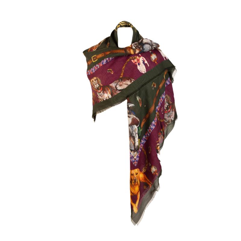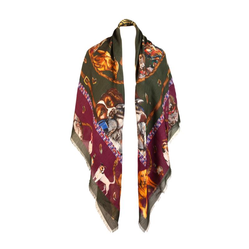 Clare Haggas It's A Dogs Life Wool & Silk Shawl - Hunter Green & Oxblood Red