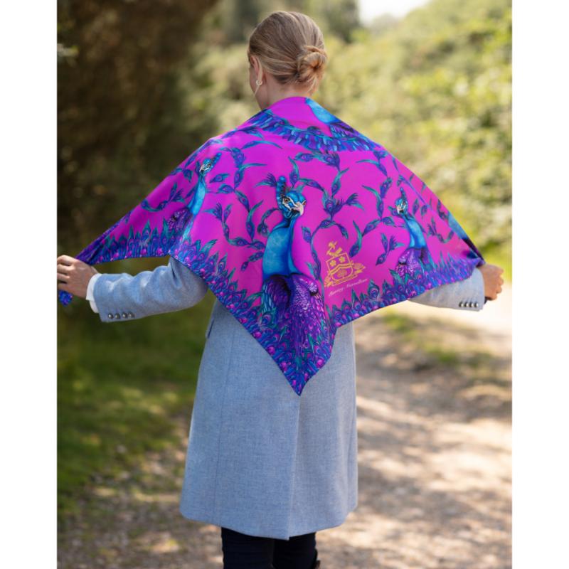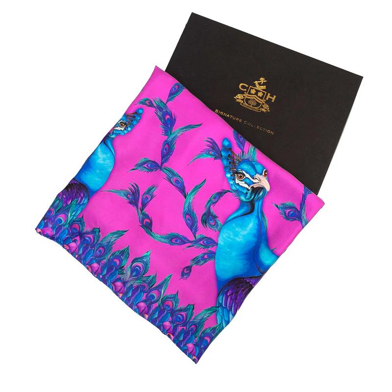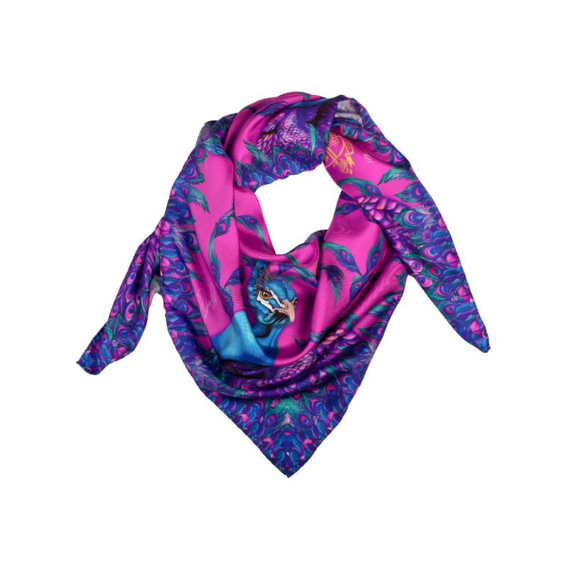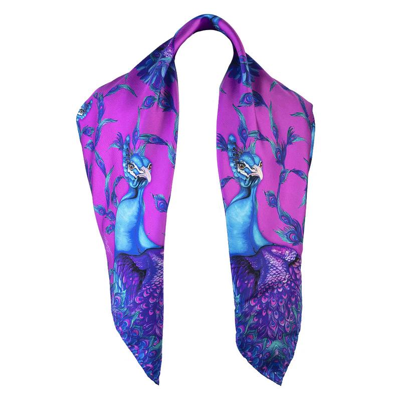 The Clare Haggas Pluming Marvellous Large Square Silk Scarf showcases vibrant peacock artwork set against a radiant Macarena background. Crafted in luxurious silk, this scarf combines bold colour with intricate design, offering a striking accessory that elevates any ensemble with expert artistry and vivid elegance.
