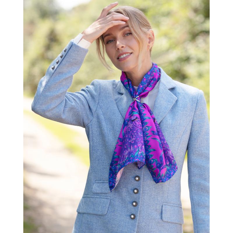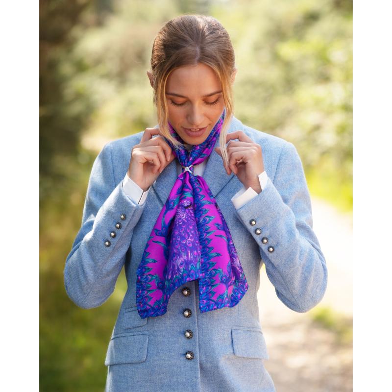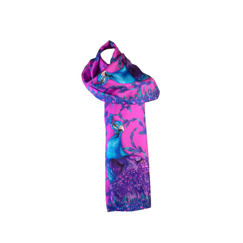 The Clare Haggas Pluming Marvellous Narrow Silk Scarf showcases vibrant peacock artwork set against a radiant Macarena background. Crafted in luxurious silk, this scarf combines bold colour with intricate design, offering a striking accessory that elevates any ensemble with expert artistry and vivid elegance.