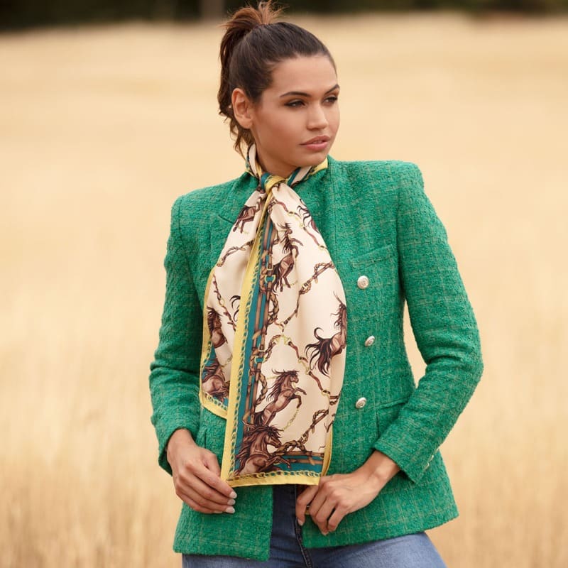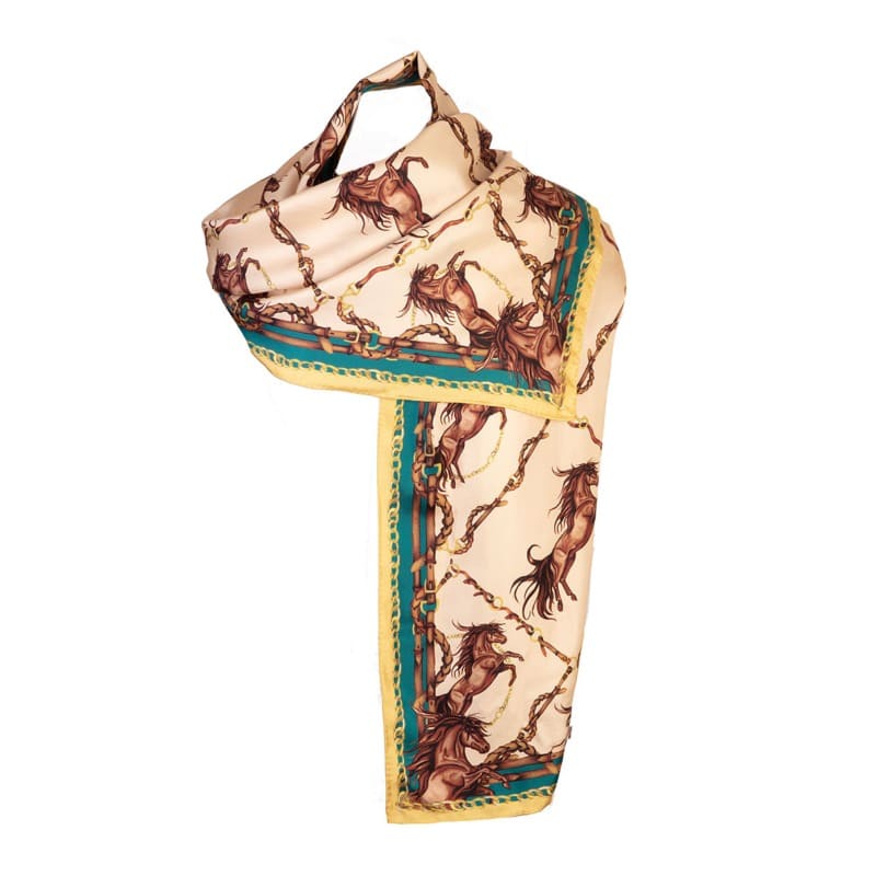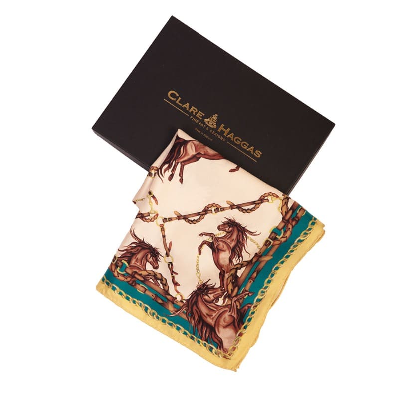 The Clare Haggas Rearing To Go Classic Silk Scarf features a charming equestrian print with majestic rearing horses and a border of bridal leathers. The vibrant colour palette will add a luxurious finishing touch to your outfit and the rectangular shape is ideal for elegantly wrapping or draping around your neck and shoulders. Crafted in England from the finest quality pure silk twill and hand finished with exquisite attention to detail. This beautiful scarf is an accessory for all occasions, whether you're dressing up or aiming for a casual country style.