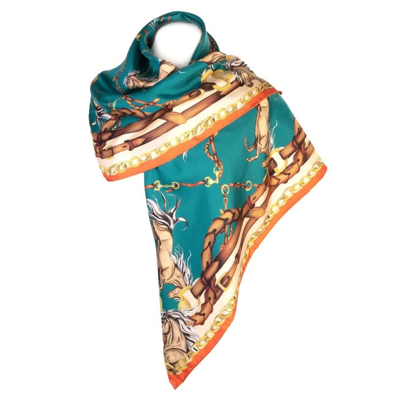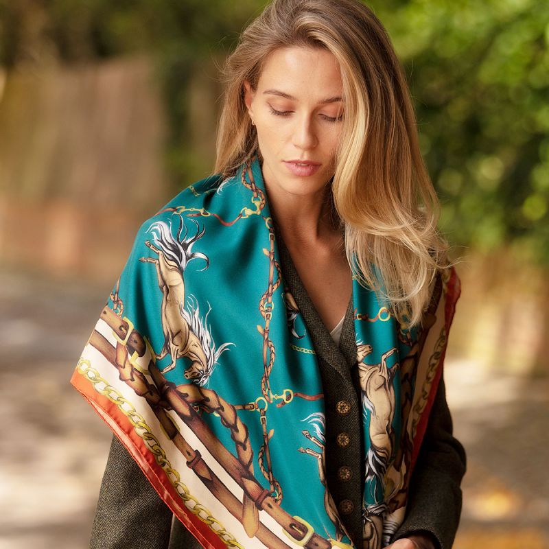 Clare Haggas Rearing To Go Large Silk Scarf - Teal & Rust