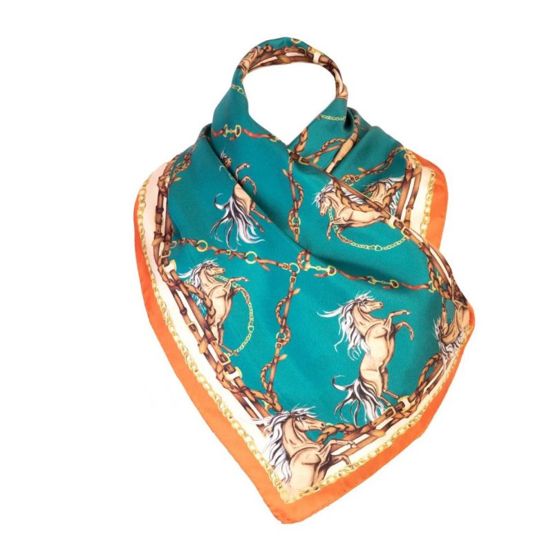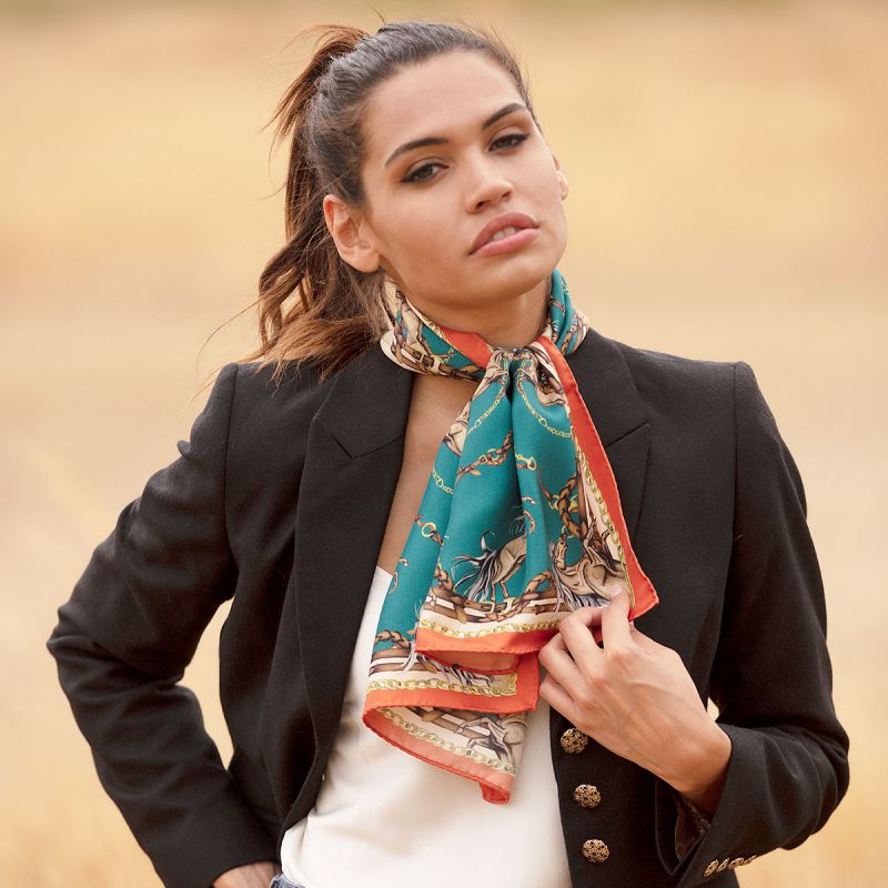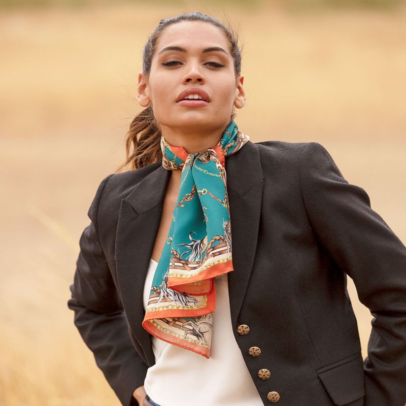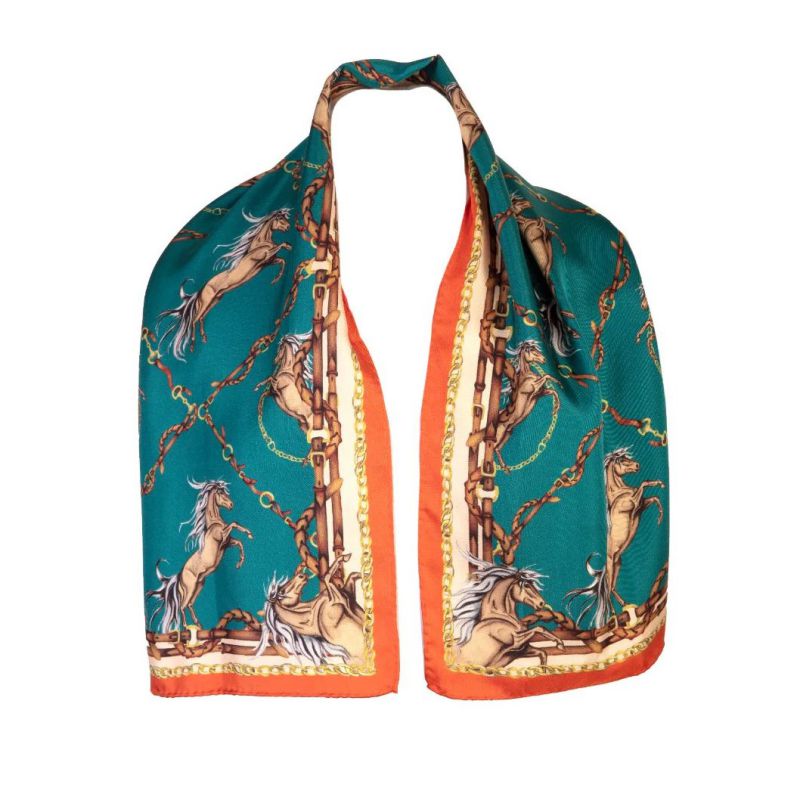 The Clare Haggas Rearing To Go Narrow Silk Scarf features a charming equestrian print with majestic rearing horses and a border of bridal leathers. The vibrant colour palette will add a luxurious finishing touch to your outfit and the rectangular shape is ideal for elegantly wrapping or draping around your neck and shoulders. Crafted in England from the finest quality pure silk twill and hand finished with exquisite attention to detail. This beautiful scarf is an accessory for all occasions, whether you're dressing up or aiming for a casual country style.
