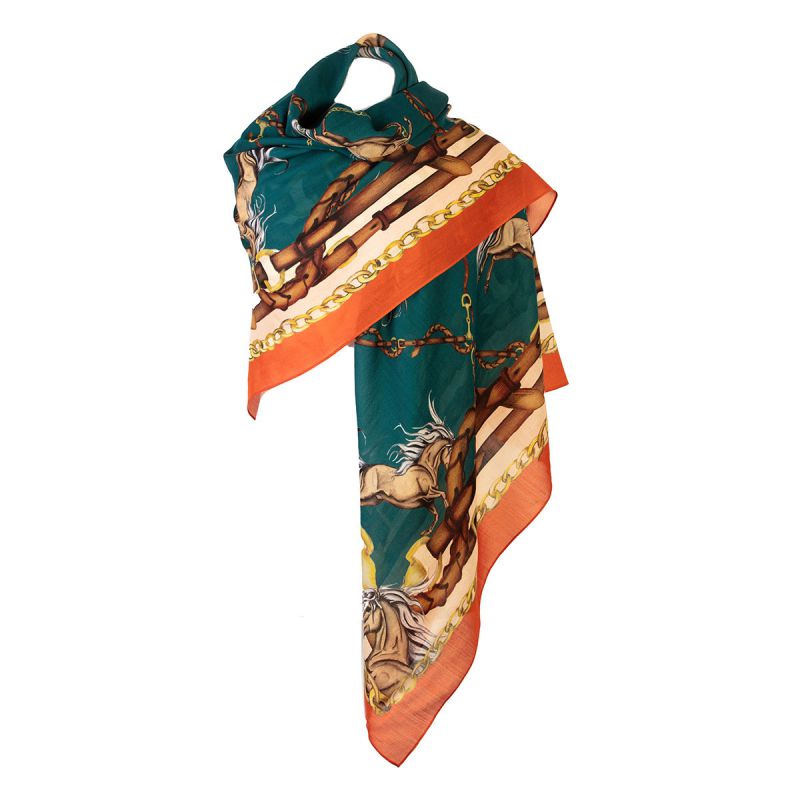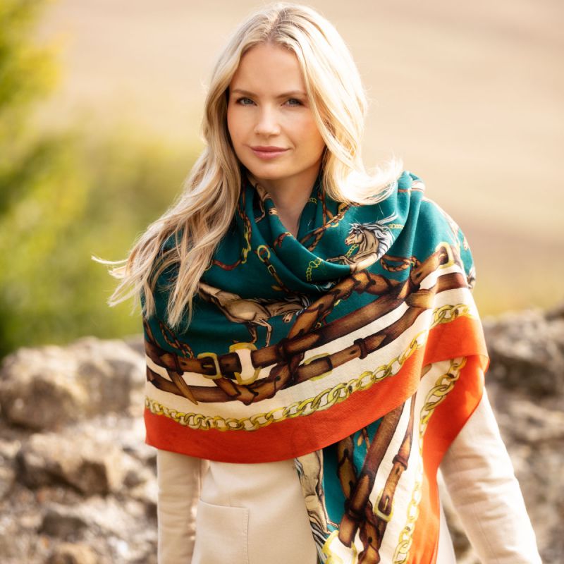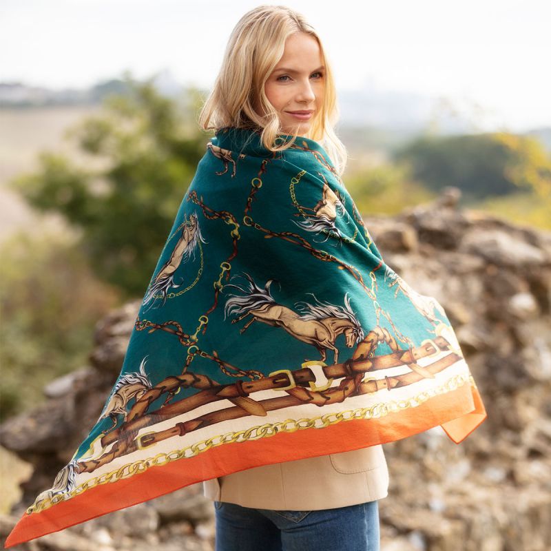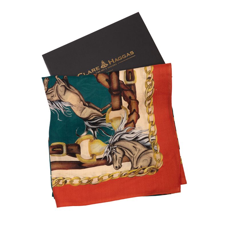 The Clare Haggas Rearing To Go Wool/Silk Shawl features a charming equestrian print with majestic rearing horses and a border of bridal leathers. The vibrant colour palette will add a luxurious finishing touch to your outfit and the large square shape means it can be worn in a variety of ways. Crafted in England from the finest quality silk and wool blend and hand finished, this scarf is more than just an accessory, it's wearable art!