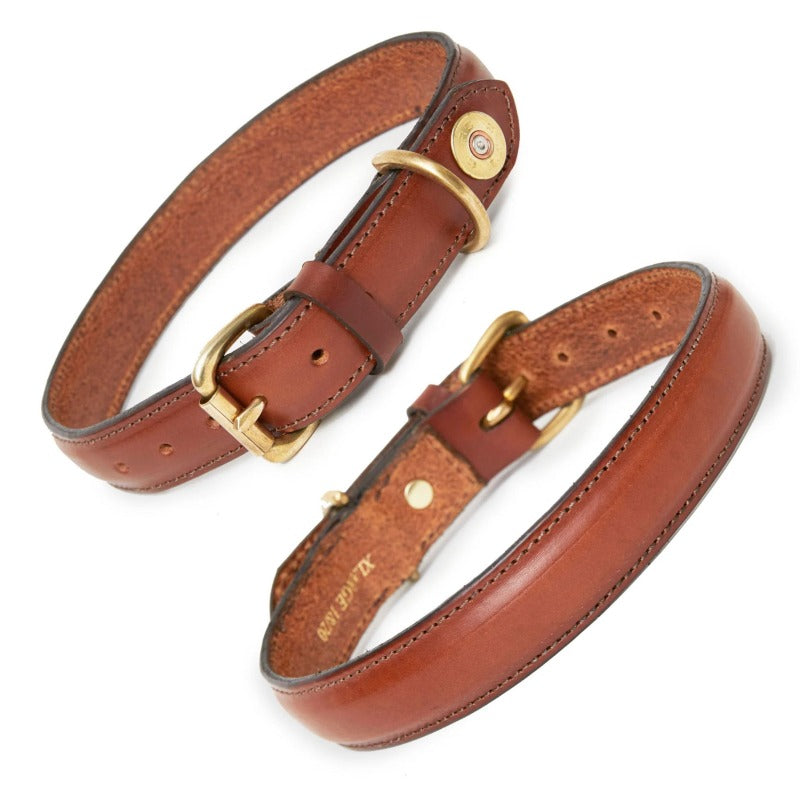 The Hicks & Hides Laverton Field Dog Collar is premium and crafted in fine quality leather in the Cotswolds with brass roller buckle and loop. Featuring a single 20 bore cartridge cap on the tip of the collar for a touch of country! For the same style collar but for smaller dogs please see the Stanway collar.