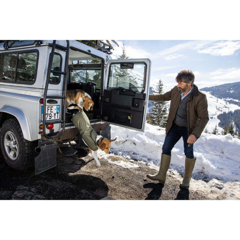 The Le Chameau Dog Coat is a smart and practical addition to your pet care kit if you have a dog that feels the cold. Crafted with a cosy fleece lining for warmth and comfort and a durable outer shell. The adjustable straps feature soft touch hook and loop fastener ensuring that your dog's fur does not get caught. There is also a very useful hole at the neck for the lead to be attached through.
