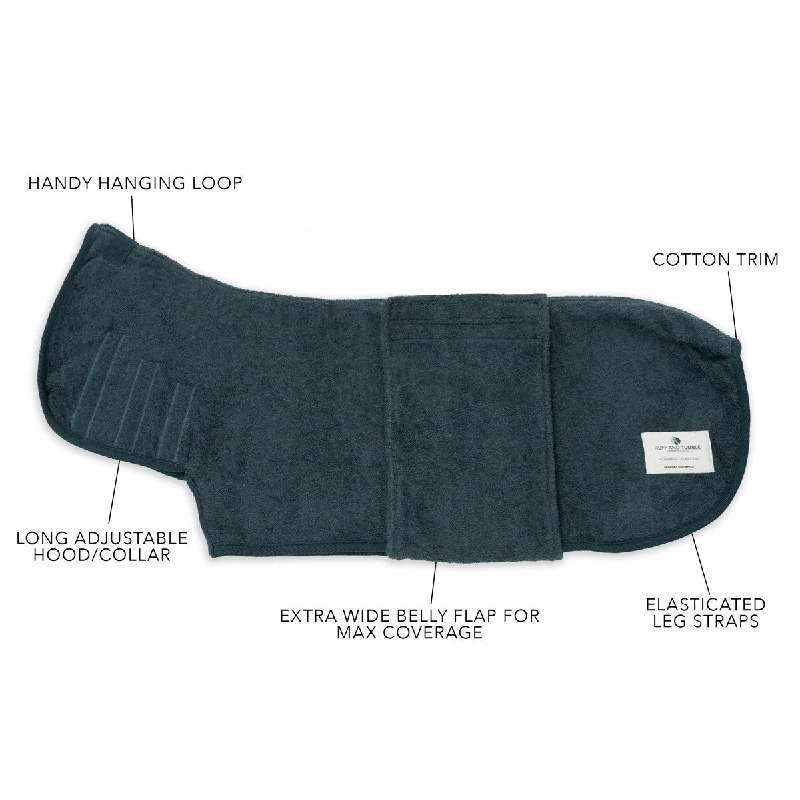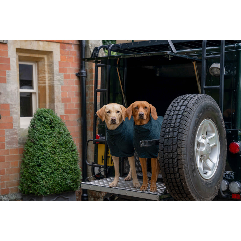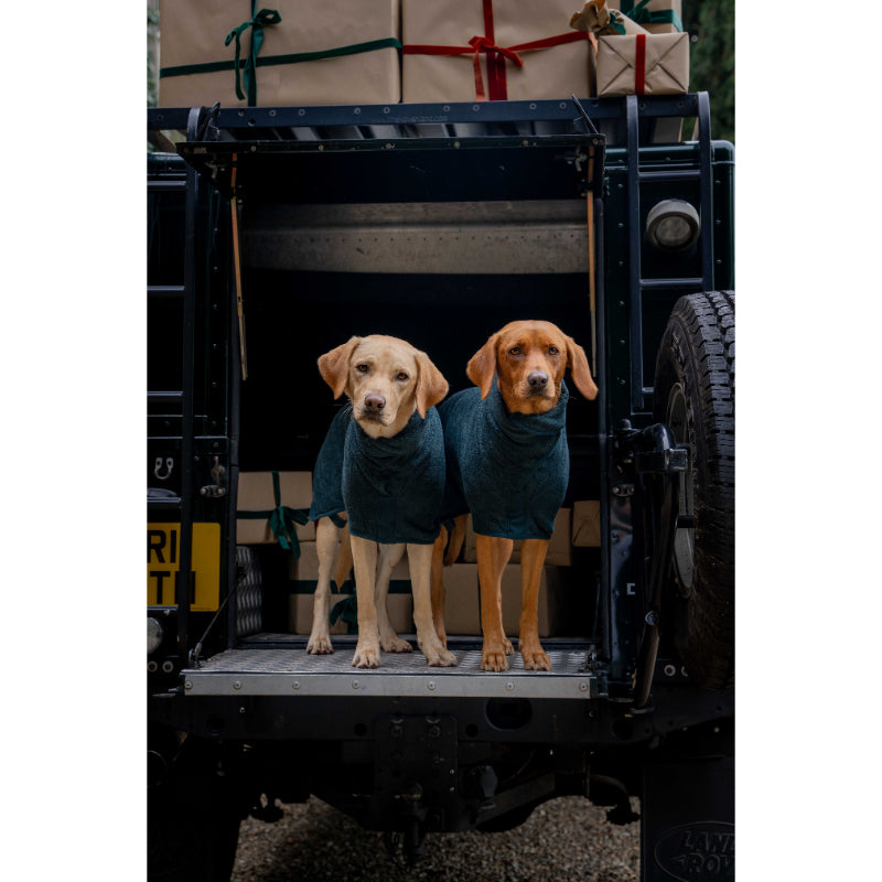 The Ruff & Tumble Classic Dog Drying Coat is made from two-layers of high-quality absorbent, breathable cotton towelling which dries your dog in minutes, wicking away moisture leaving your dog dry and comfortable. With a unique longer length adjustable collar to dry ears and head. Perfect for after a wet day’s shooting, wet walks, or after a visit to the beach. Ideal for keeping your car and home free from a wet dog!