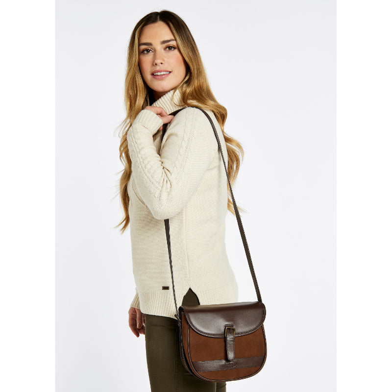 The Dubarry Clara Handbag Walnut combining smooth and crushed leathers with an adjustable strap, branded lining, internal zip pocket and branded metal trims, this neat compact bag ticks all the boxes!