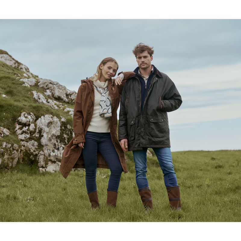 The Dubarry Brunswick Mens Primaloft Wax Jacket is a lightweight garment with a water repellent finish together with a PrimaLoft fill, which has been quilt stitched to its cotton lining for added warmth. Comfort is further provided courtesy of an adjustable waist, handwarmer pockets at the chest and knitted inner cuffs. The jacket's raglan sleeves and studded, double back vent will allow for optimum freedom of movement, handy if you are active in the countryside. The jacket is also rather stylish, featuring a contrasting corduroy collar, large patch pockets with studded flap and leather trim detail to the chest pockets and cuffs.