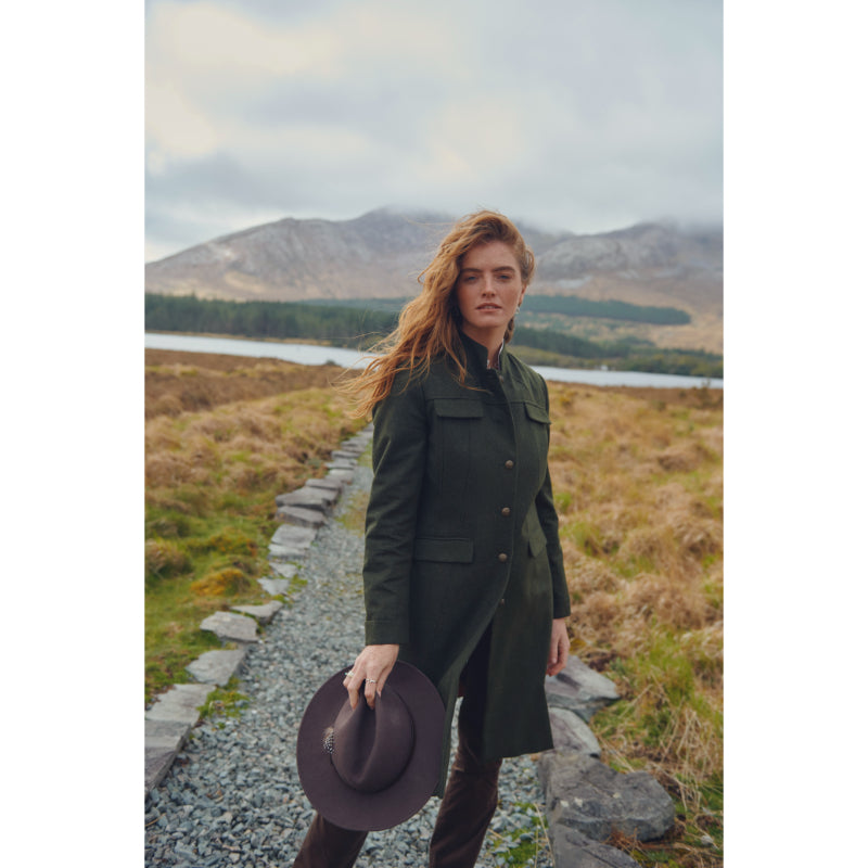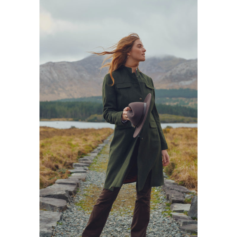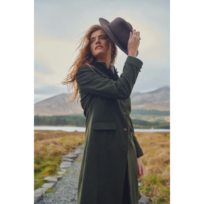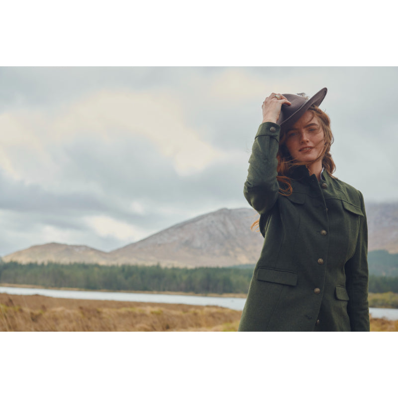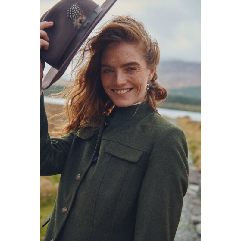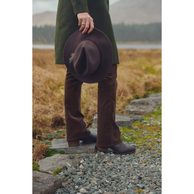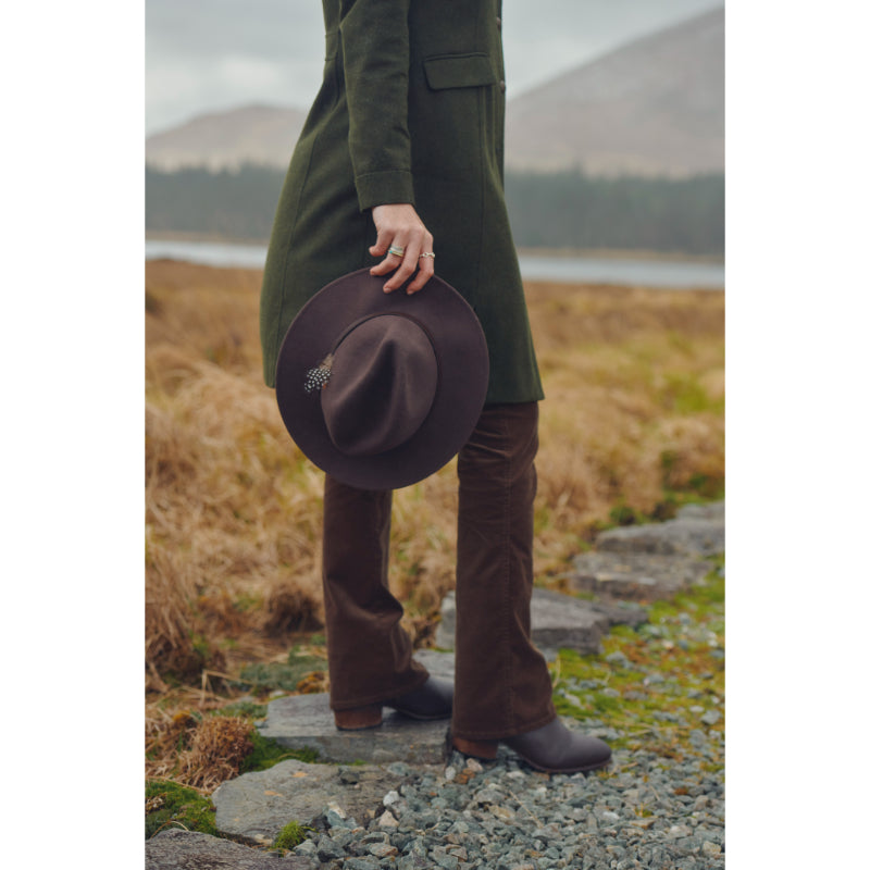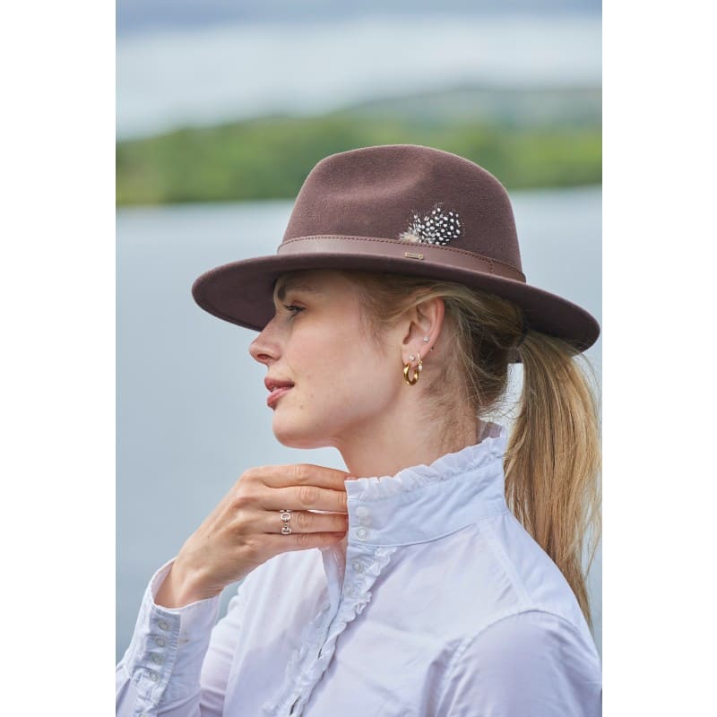 The Gallagher Ladies Felt Fedora Hat from Dubarry is a wonderful finishing touch to your outfit, whether you're in the field, at the races or running errands in style. Crafted from a durable heavy duty felt with a chic leather band, delicately trimmed with a cluster of beautiful gamebird feathers and featuring an internal headband for added comfort.