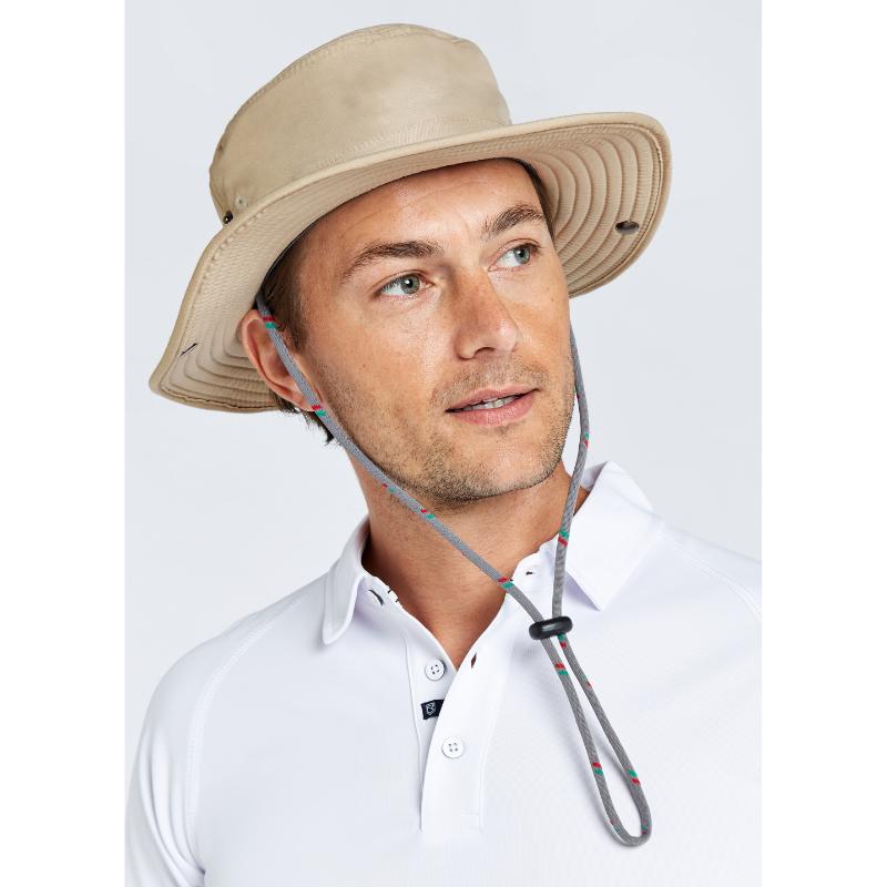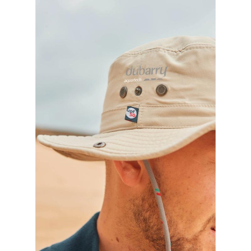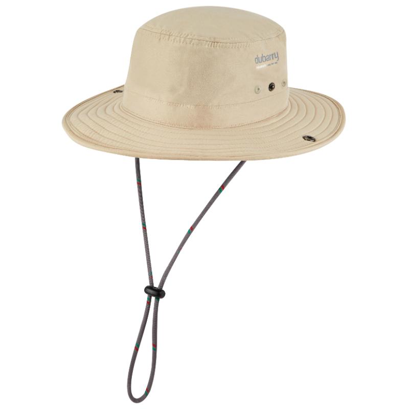 The Dubarry Genoa Brimmed Sun Hat in Stone is made with 100% lightweight synthetic material for quick drying and water repellency. Its UPF 50 protective finish shields your head from harmful sun rays, while the retention cord ensures a secure fit. Perfect for outdoor activities.