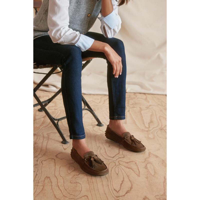 The Fairfax & Favor Rutland Ladies Suede Driving Shoe is a timeless classic with a fresh twist. Featuring shiny light gold shield hardware and a padded insole, these shoes offer both style and comfort. Individually handmade in Portugal from sustainably sourced suede, they're a must-have addition to any footwear collection.