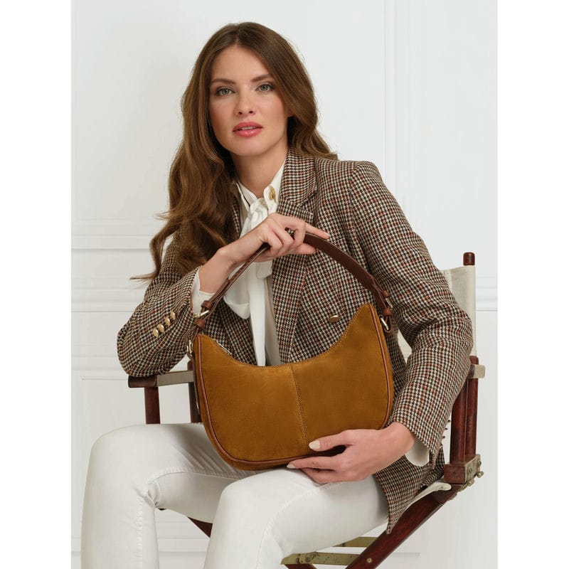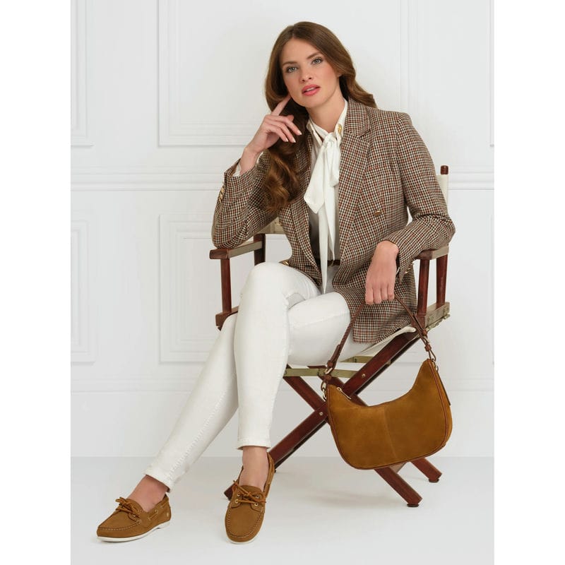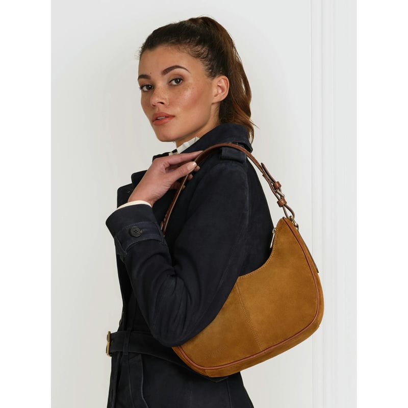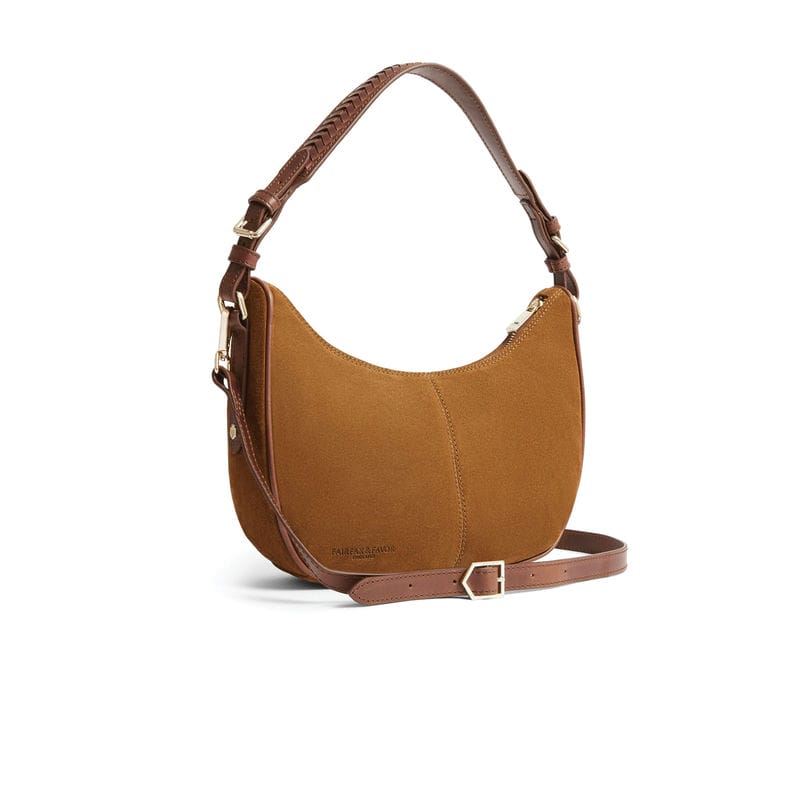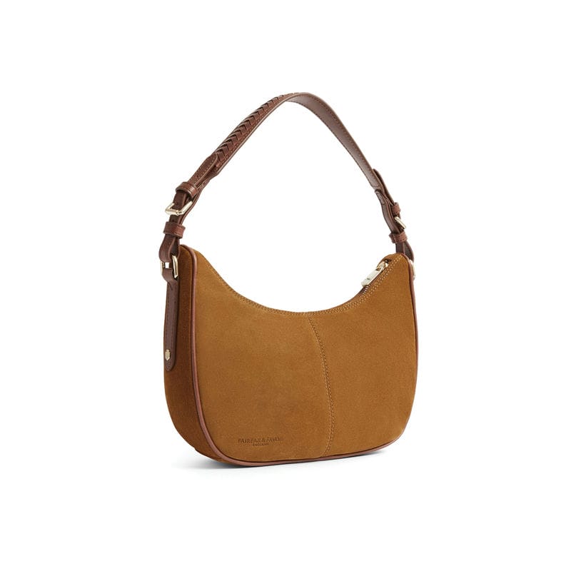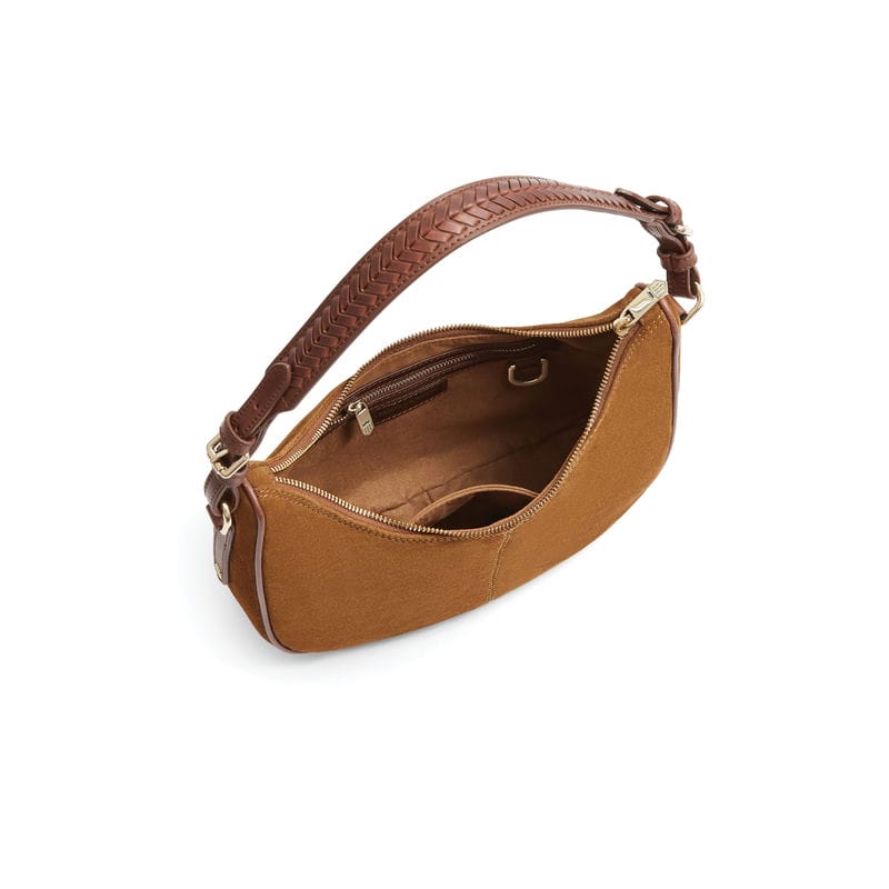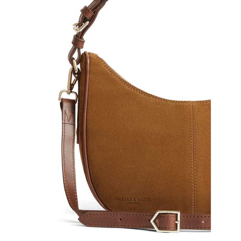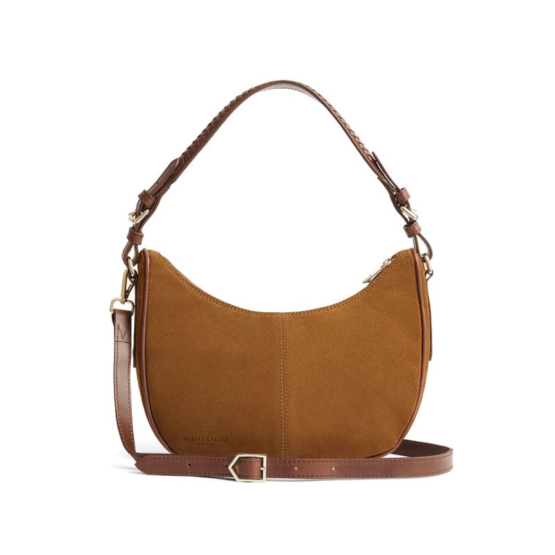 The Fairfax & Favor Tetbury Crescent Ladies Shoulder Bag is a fresh addition to the Tetbury family, crafted from soft suede and features two versatile detachable leather straps. Its two in one design allows you to wear it as a crossbody for errands and weekend adventures, or as a handbag for casual afternoons. A timelessly stylish slouchy design with a new crescent shape and braided leather shoulder strap to complete the look. Perfect for the effortless on-the-go style!