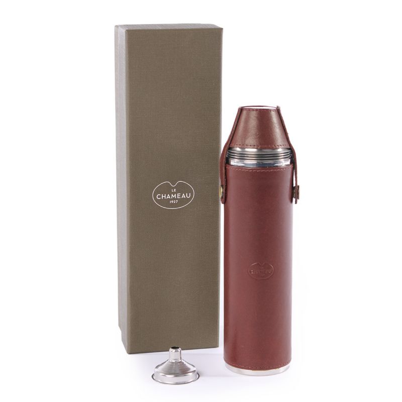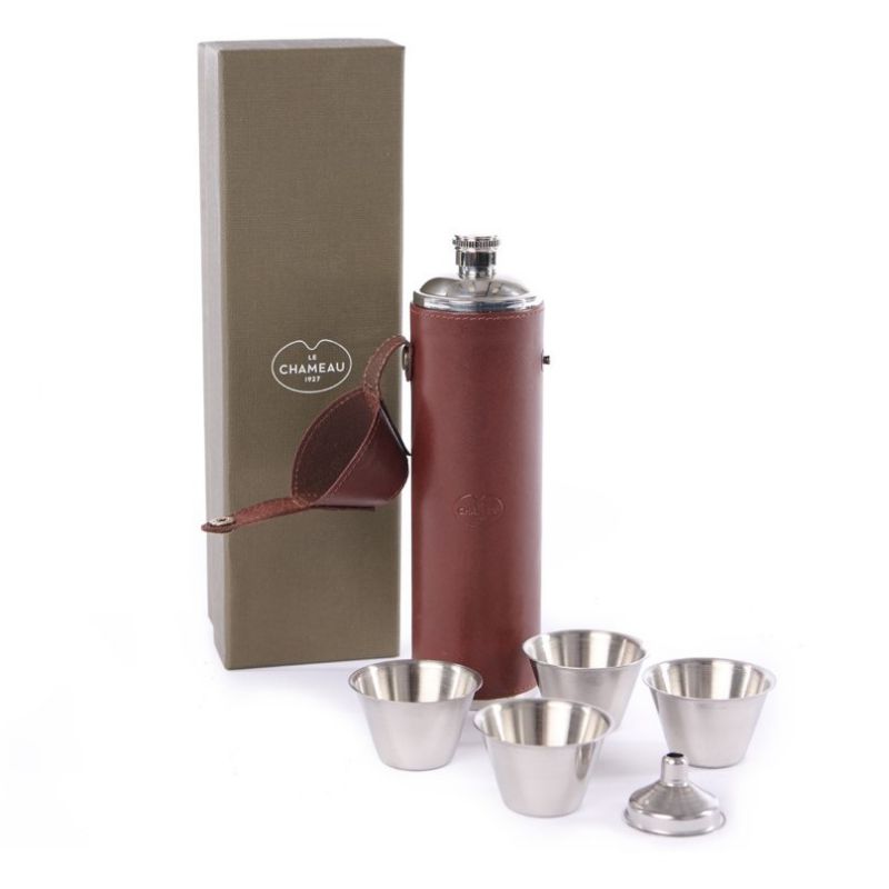 The Le Chameau Rounded Leather Hip Flask is a sleek and stylish accessory. Its leather wrap gives it a luxurious look and feel, enhanced by the embossed Le Chameau logo. It holds a generous 12 oz (350ml) and comes with 4 shot glasses stored in the lid. It also includes a funnel for precise filling.