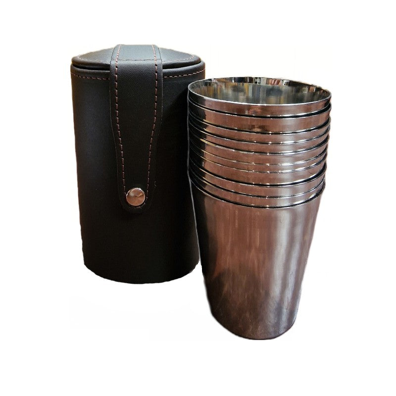 Set of 6 or 10 stainless steel nesting beakers contained in a finest quality hand crafted leather case. The 10 sets can be used as a position finder.