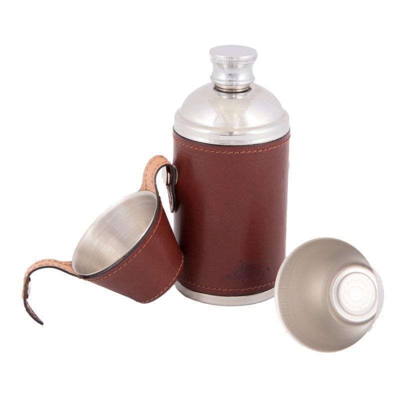 Stainless steel flask wrapped in the finest leather with stainless steel cups stored within the leather lid cover. Beautifully constructed and ever so useful.