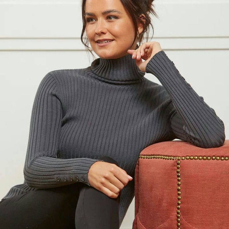 Guinea's Skinny Rib Ladies Merino Roll Neck Knit is crafted from a luxurious merino blend which is breathable yet super soft and this knit will not loose its shape. Elegantly tailored with skinny rib detailing, fold over roll neck and delicate button detail to cuffs. Easy to wear comfortable casual chic.