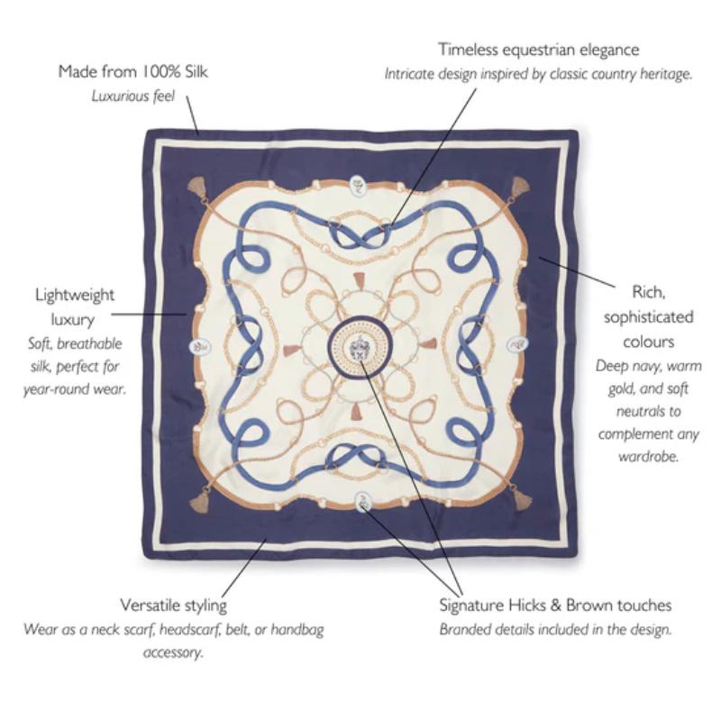 Elevate your wardrobe with the Hicks & Brown Melford Silk Scarf. Crafted from 100% pure silk, it offers a soft texture and natural drape, balancing luxury with comfort. Its equestrian-inspired design and subtle branding reflect classic country heritage, making it a timeless accessory. Lightweight and breathable, this 100cm square scarf adds effortless elegance to any outfit. Presented in a branded dust bag, it’s perfect for both everyday wear and special occasions.