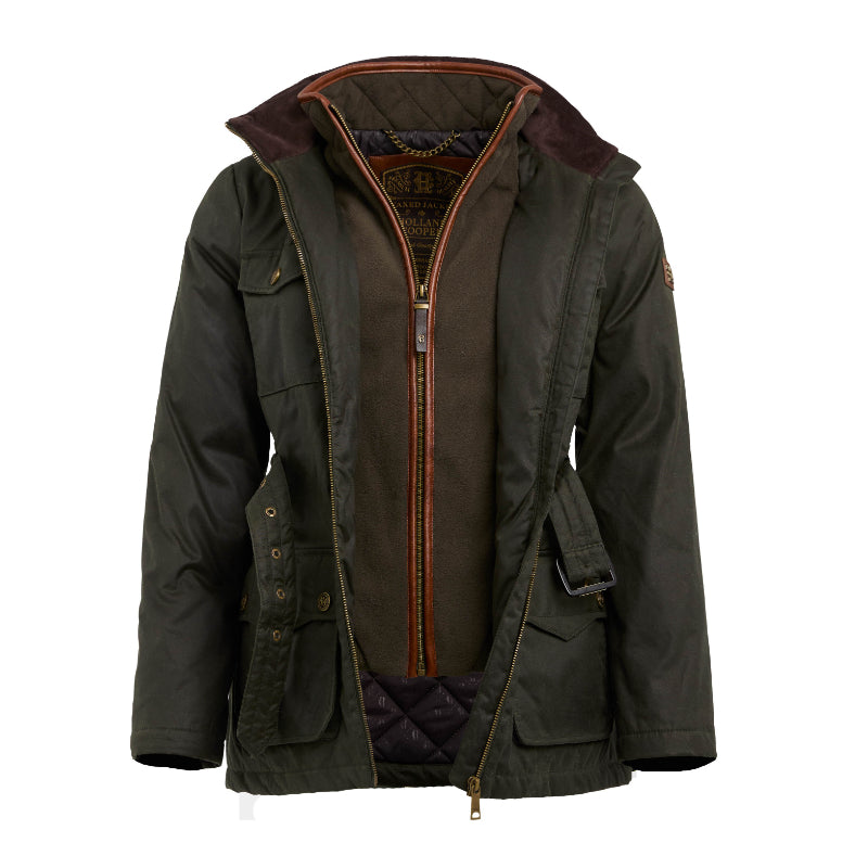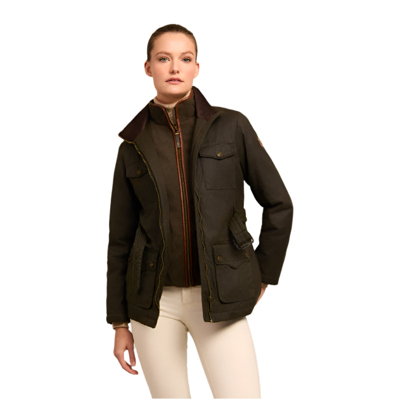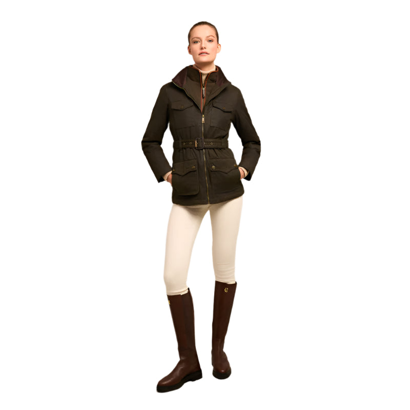 Expertly crafted from premium waxed cotton, the Holland Cooper Belted Waxed Ladies Jacket in Dark Olive exudes timeless British countryside elegance. The belted silhouette offers a refined, tailored fit while practical pockets maintain a classic field jacket look. Stay warm with a luxurious mock gilet in signature fleece and a sumptuous suede-touch collar. With meticulous details like antique brass hardware and a leather sleeve badge, this jacket is a quintessential combination of heritage craftsmanship and modern sophistication.