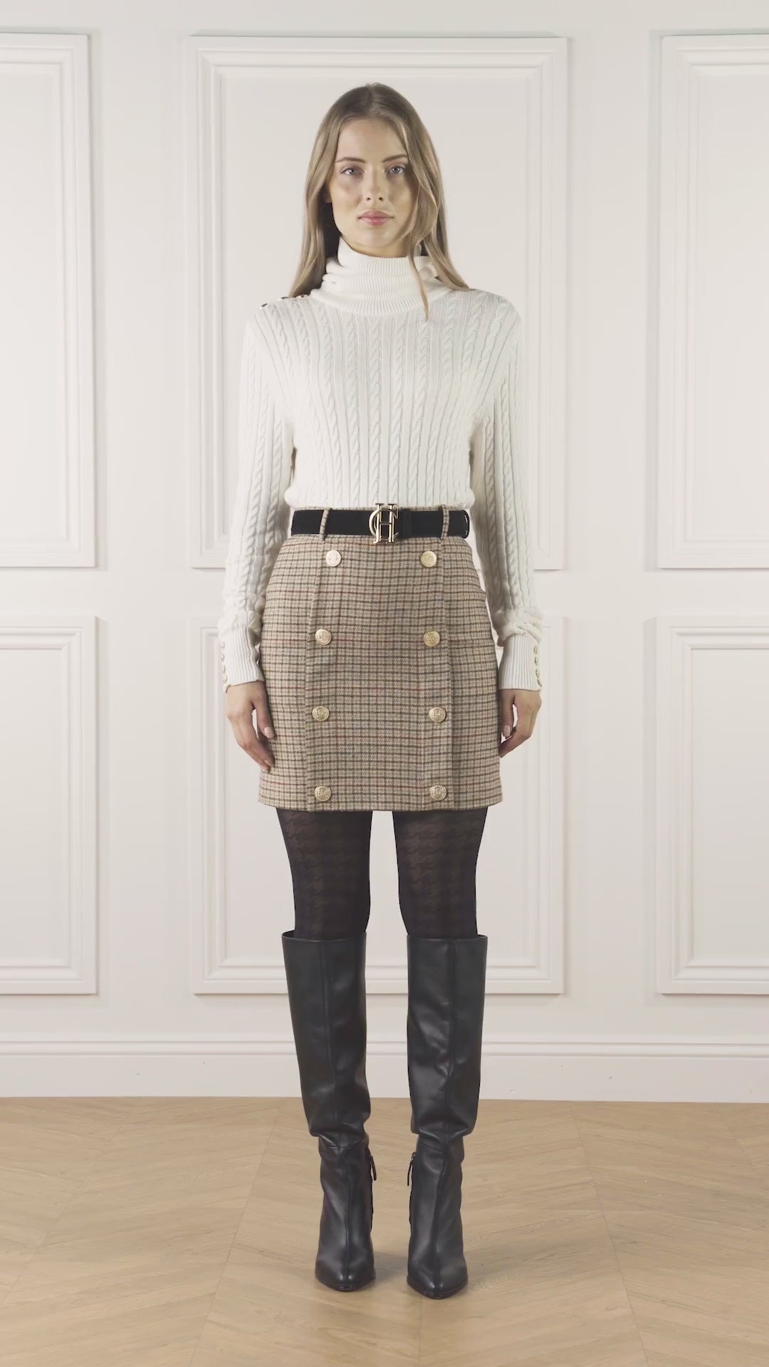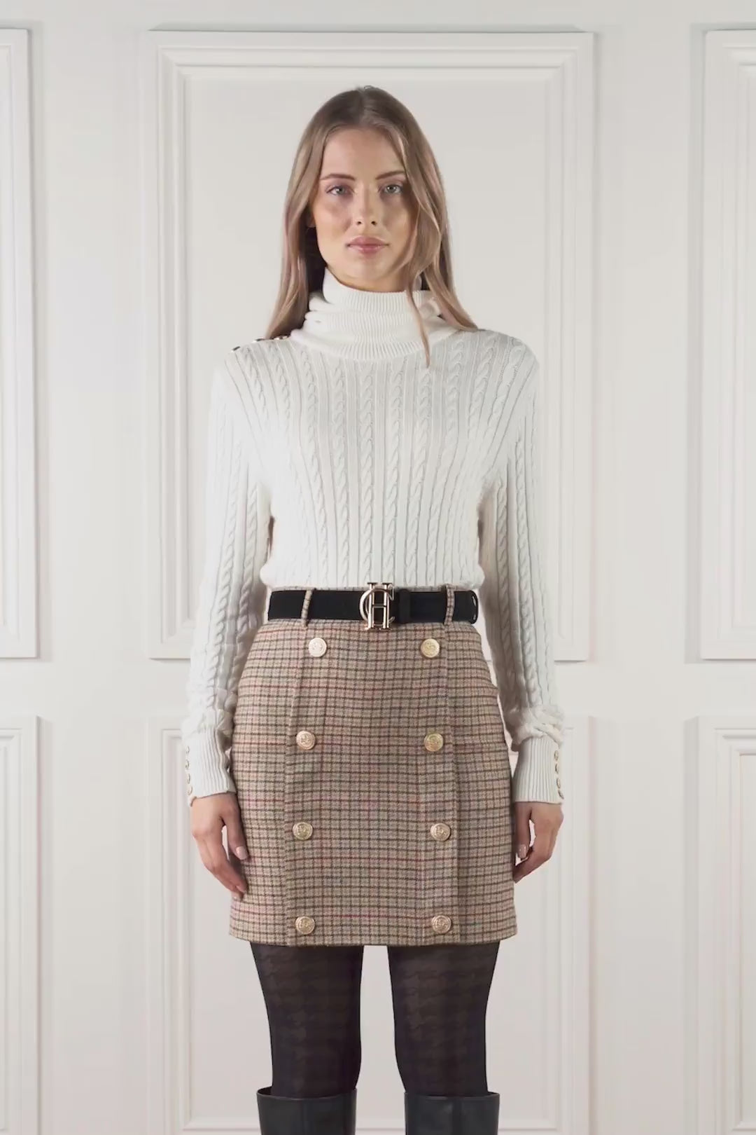 The exceptionally stylish Holland Cooper Knightsbridge Ladies Tweed Skirt is a modern take on the traditional pencil skirt, designed in a contemporary mini length. The mid-weight tweed is crafted by hand from 100% British wool and offers a gorgeous autumnal palette of colours that is sure to complement a range of outfits. Expertly tailored for a slim fitting outline with a button fastening at the waist, invisible zip fastening at the back and centre back hem vent for movement. Finished with the classic Holland Cooper signature details including branded gold metal hardware.