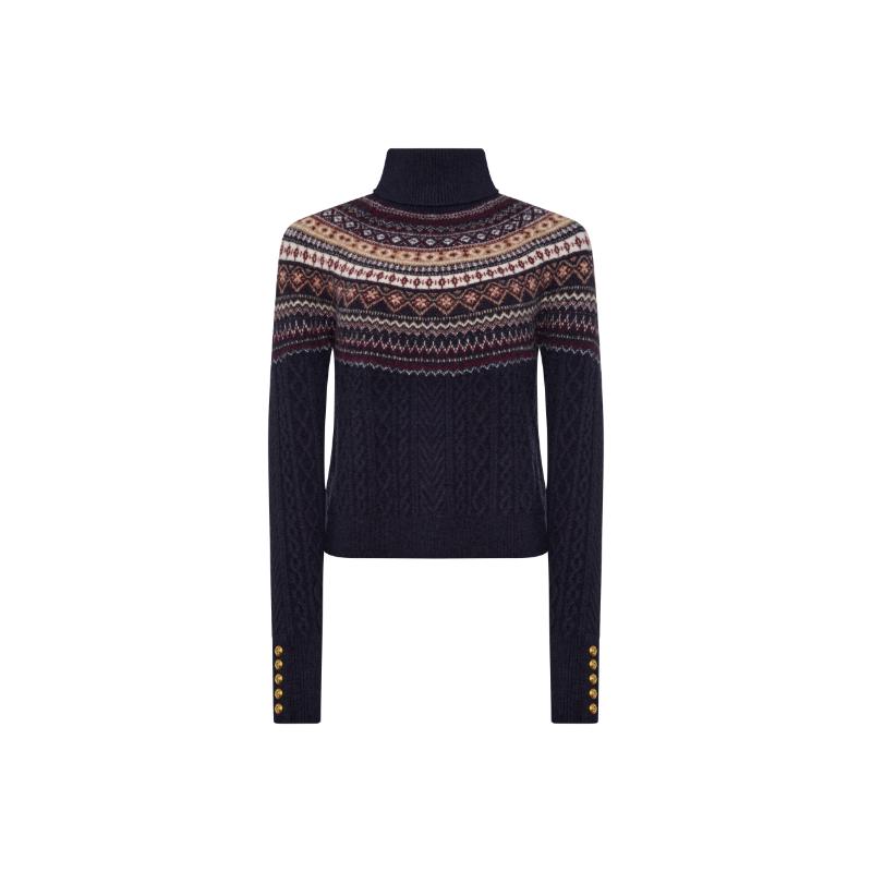 The Rebecca Ladies Roll Neck Knit Jumper exemplifies refined British knitwear craftsmanship. Constructed from a luxuriously soft wool blend, this piece seamlessly integrates traditional Fair Isle and cable-knit techniques with a contemporary relaxed aesthetic. The expertly tailored raglan and blouson sleeves establish a distinctly modern silhouette, whilst carefully considered hardware accents on the cuffs and the signature HC Heraldic plaque at the neckline elevate the design with understated sophistication. Equally versatile worn as a standalone statement or layered beneath outerwear, this knit represents an essential investment for the discerning wardrobe.