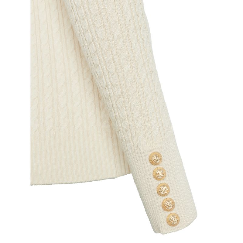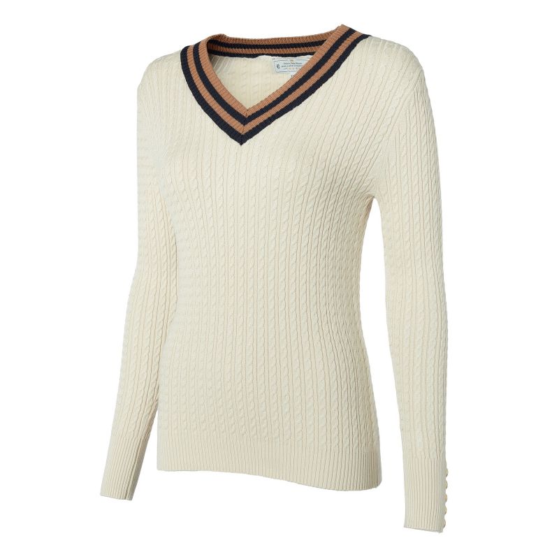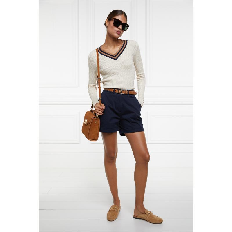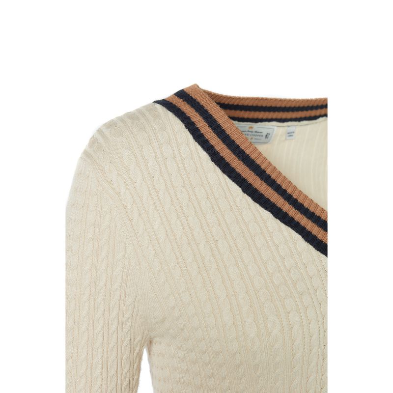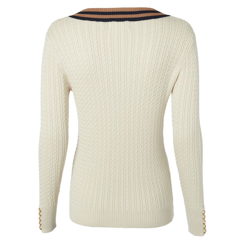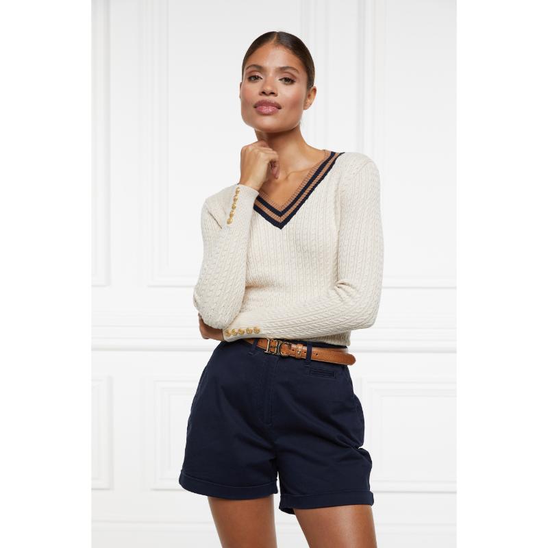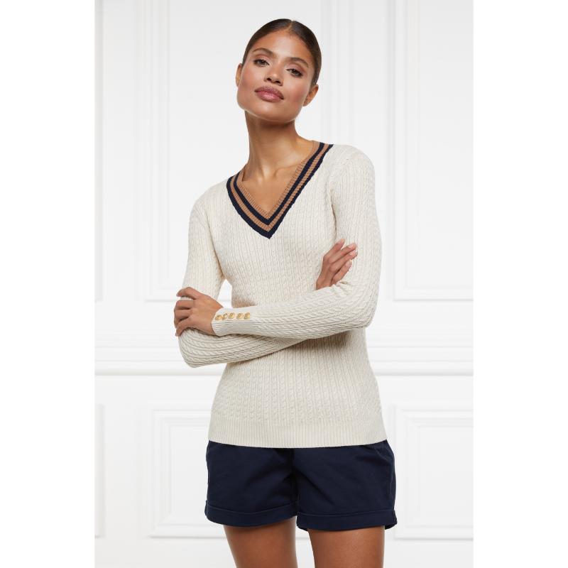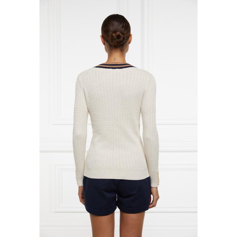 Made from a luxuriously soft blend of yarn, the Holland Cooper Zoe Ladies Knit Jumper features a sleek silhouette and deep v-neckline. Its distinct cable knit pattern and contrasting striped collar add a touch of sophistication to your daily wardrobe. Finished with signature Holland Cooper gold hardware on the cuffs.