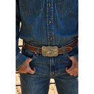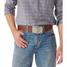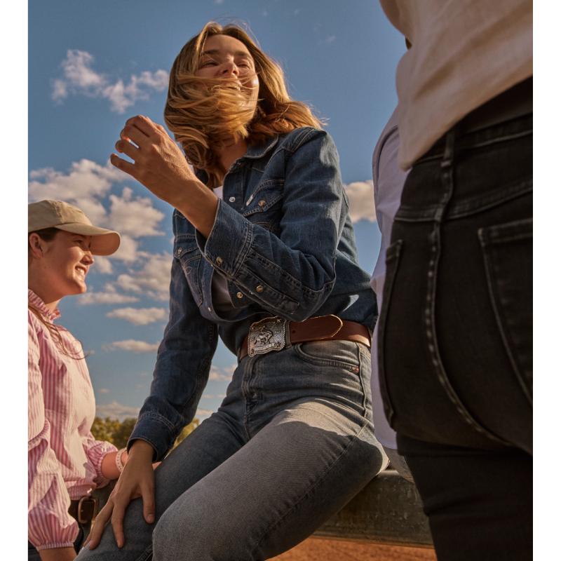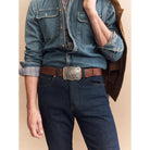 The R.M.Williams Cloudbuster Trophy Buckle in antique silver finish features intricate rope edge detailing and a raised logo alongside the iconic cloudbuster design. Crafted to complement RMW Traditional Belt, this buckle adds a distinguished and timeless accent to your attire, reflecting both heritage and craftsmanship.