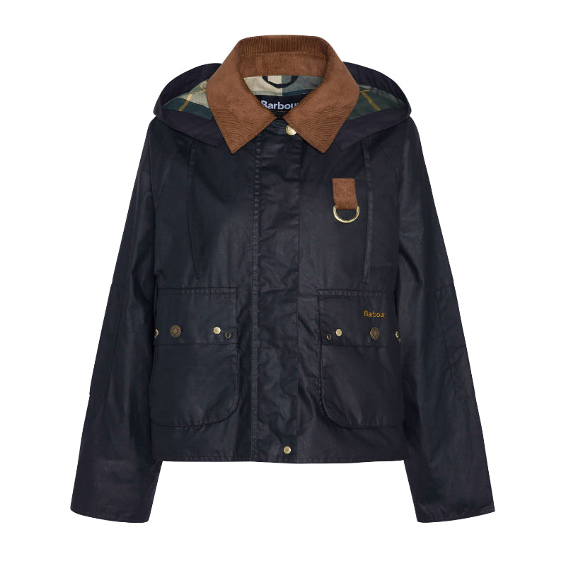 The Barbour Erma Ladies Wax Jacket boasts a classic and functional design, inspired by traditional Spey fishing attire. Its detachable hood, cord collar, and bellow pockets with stud detail offer practicality, while the iconic tartan print adds a touch of heritage style. Stay dry and stylish in this A-line jacket.