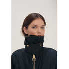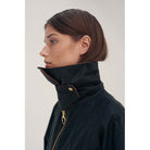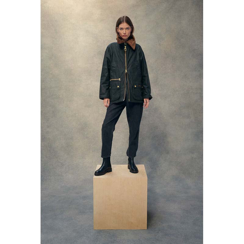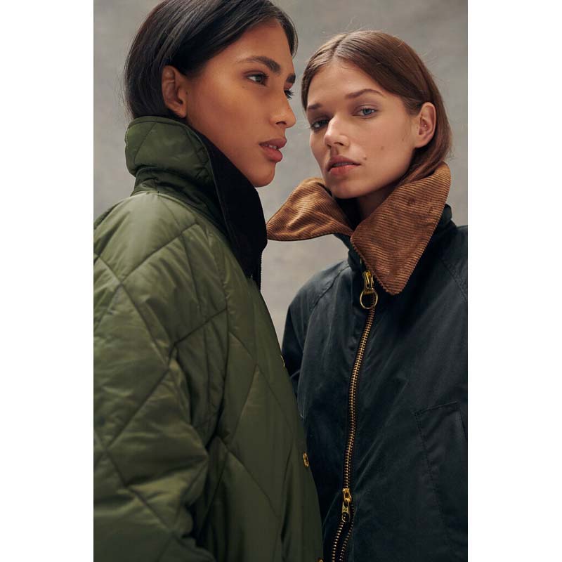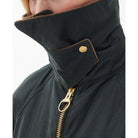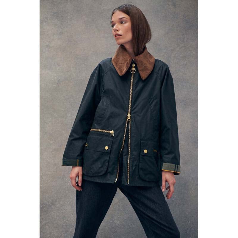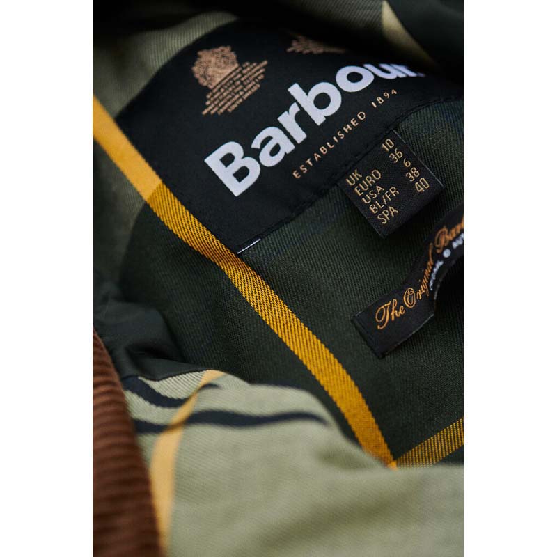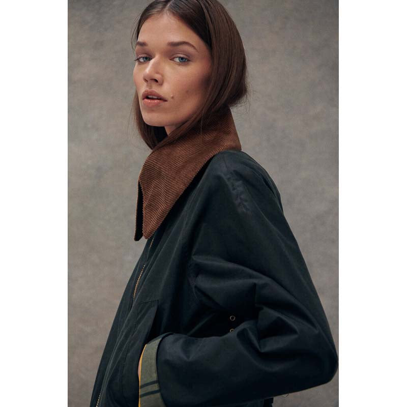 This Barbour Gunnerside Ladies Wax Jacket is a statement in style and practicality. Crafted from 100% waxed cotton, this Bedale-inspired jacket features an oversized cord collar with a hook and bar closure for a secure fit, as well as an exposed chunky metal front zip fastening and pocket. Plus, the tartan under cuff and inner lining add a classic Barbour feel. Sponge clean only.