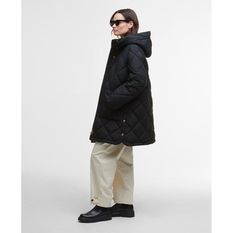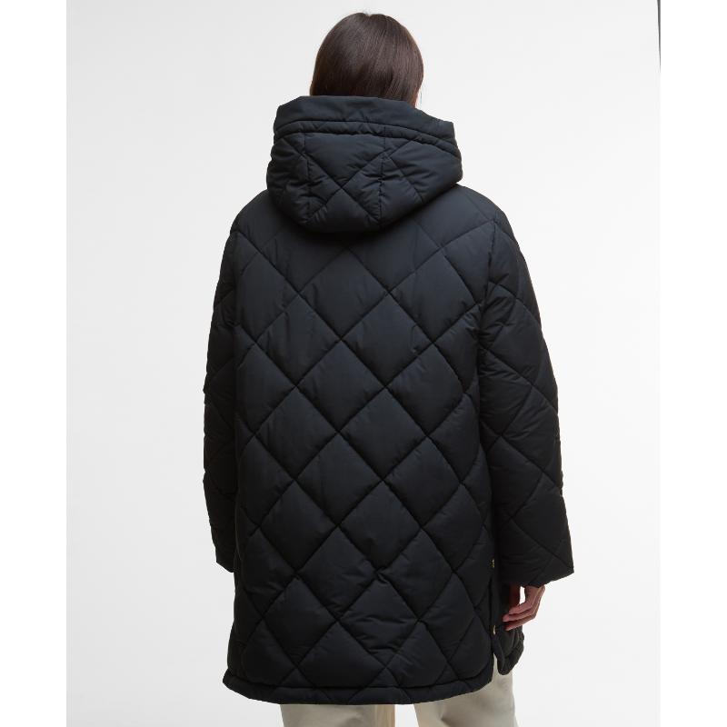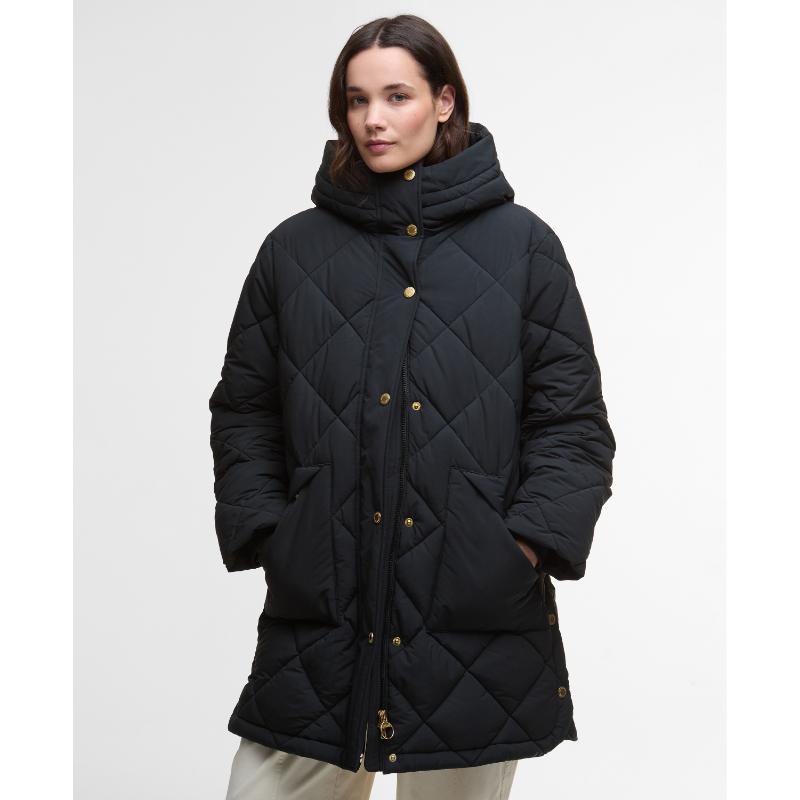 The Barbour Kailyn Ladies Puffer Jacket combines functional warmth with refined style. Its four-inch box quilt design ensures effective insulation, while the fitted hood provides added protection against cold weather. A studded placket conceals a secure zip closure, complemented by welt entry patch pockets for convenient storage. Adjustable studded side vents enhance comfort and mobility. Signature tartan lining in the hood and back buggy adds a classic Barbour heritage touch, making this jacket a sophisticated choice for cooler days.