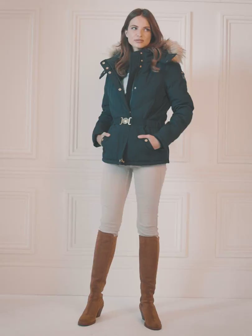 The Fairfax & Favor Charlotte Padded Ladies Jacket is a stylish and practical way to stay warm this winter. Crafted with water-resistant and wind-resistant fabric, this hip-length jacket is designed with a chic faux fur trim and a detachable hood for added warmth. The branded belt adds a stylish finishing touch. Perfect for country walks or après ski looks.