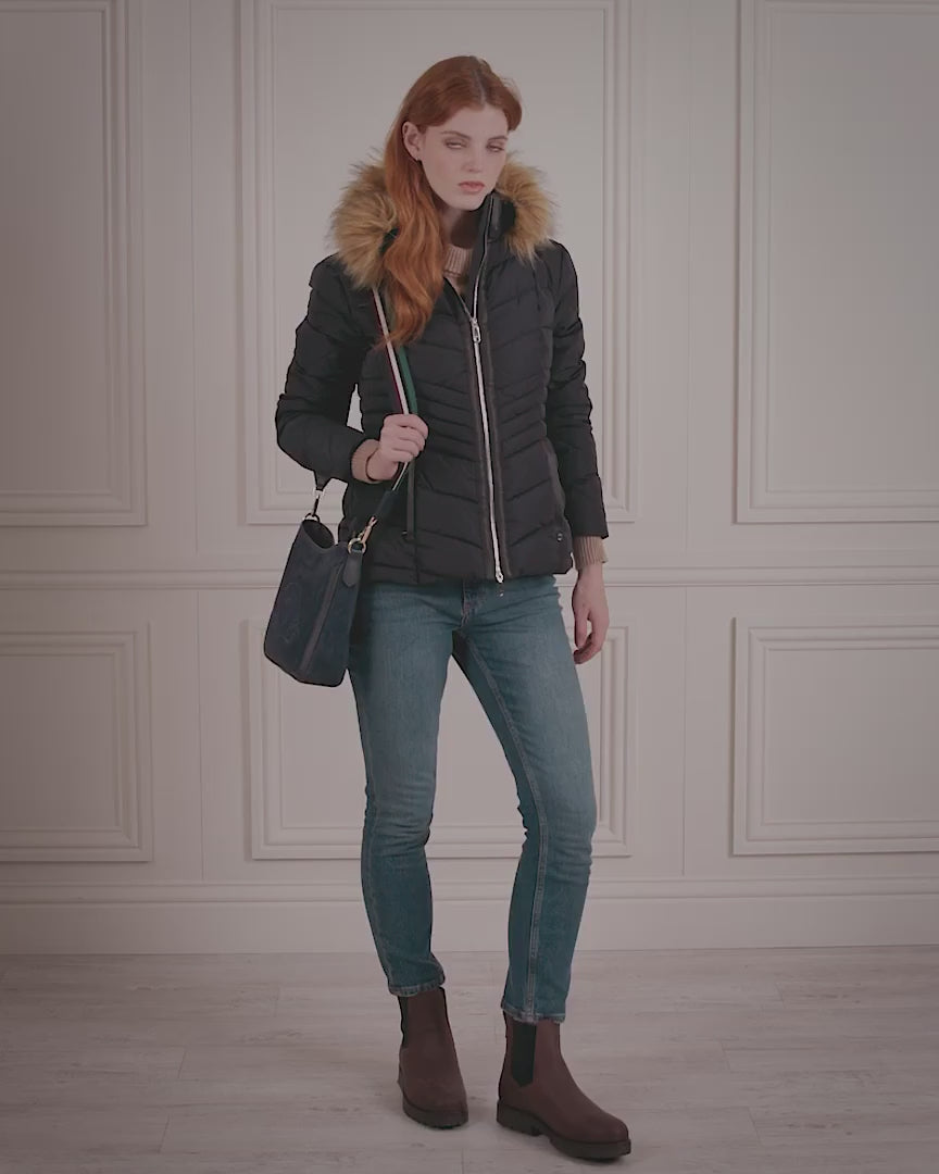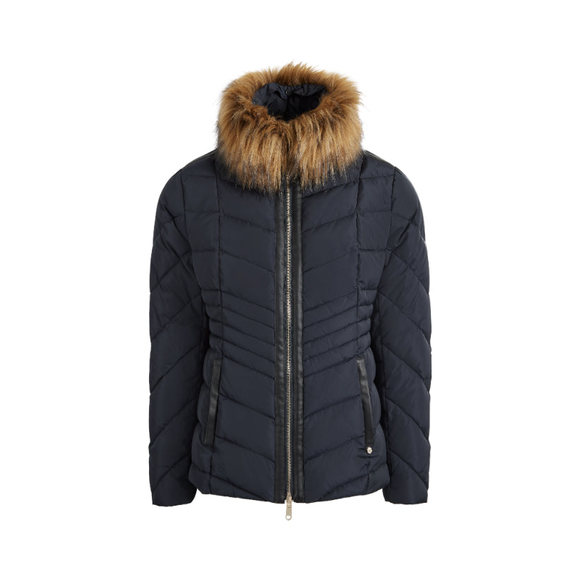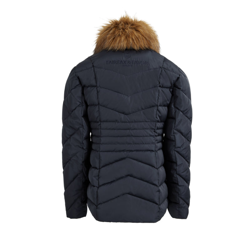 Introducing the Fairfax & Favor Pippa Padded Ladies Jacket in Navy, a refined and practical country classic with water resistant finish and faux-leather trim. The high neck and detachable faux fur collar provide luxurious warmth, while the flattering hip length silhouette exudes sophistication and luxury. With F&F shield branding and embroidery details, this jacket is both stylish and functional. The Fairfax & Favor Pippa Jacket is perfect for both casual outings and active adventures, providing both warmth and fashionable design elements.