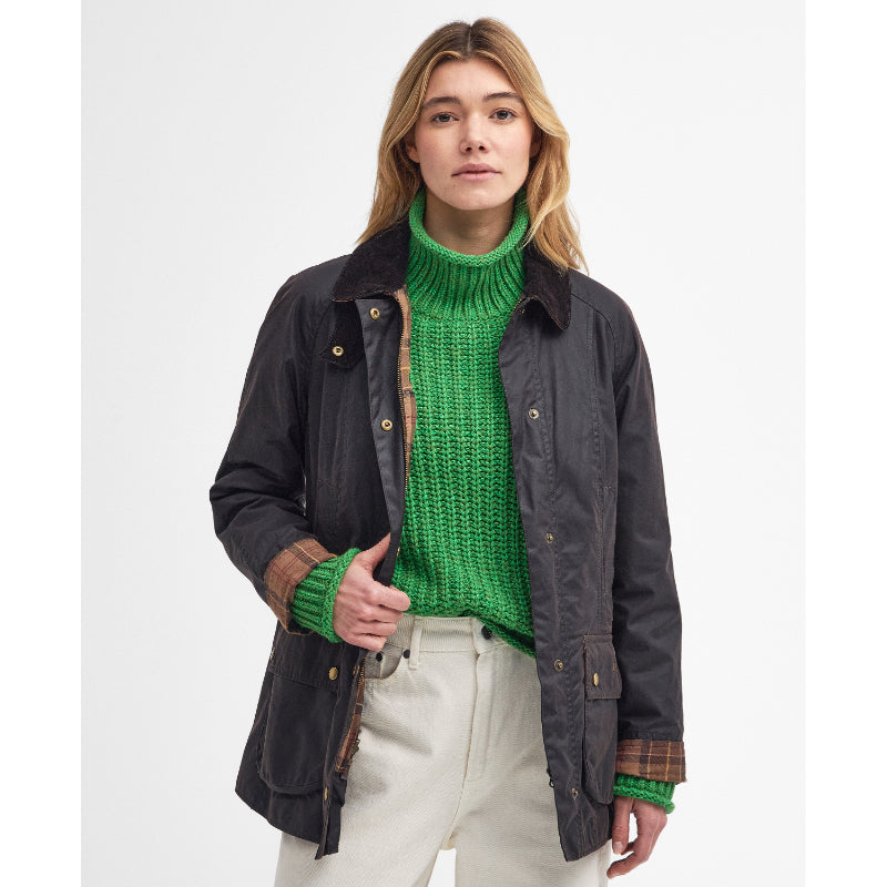 The Barbour Beadnell Ladies Wax Jacket is ideal for everyday wear, crafted in 6oz waxed cotton and lined in classic tartan. The Beadnell is timeless, designed around a relaxed, feminine fit with hand warmer pockets, lower patch pockets and finished with a nod to Barbour's heritage by way of a traditional corduroy collar.