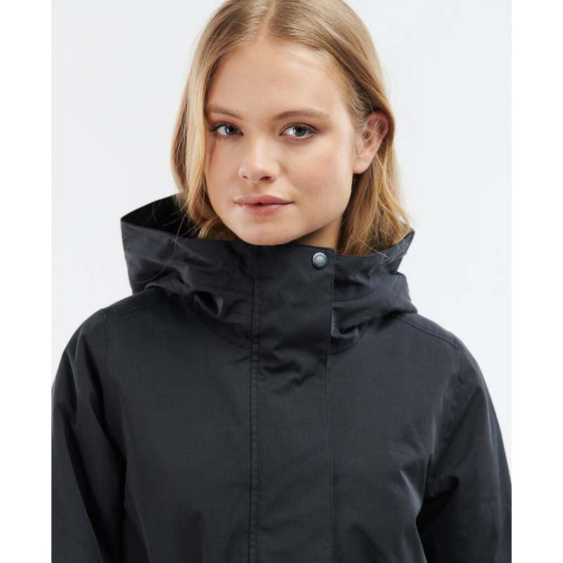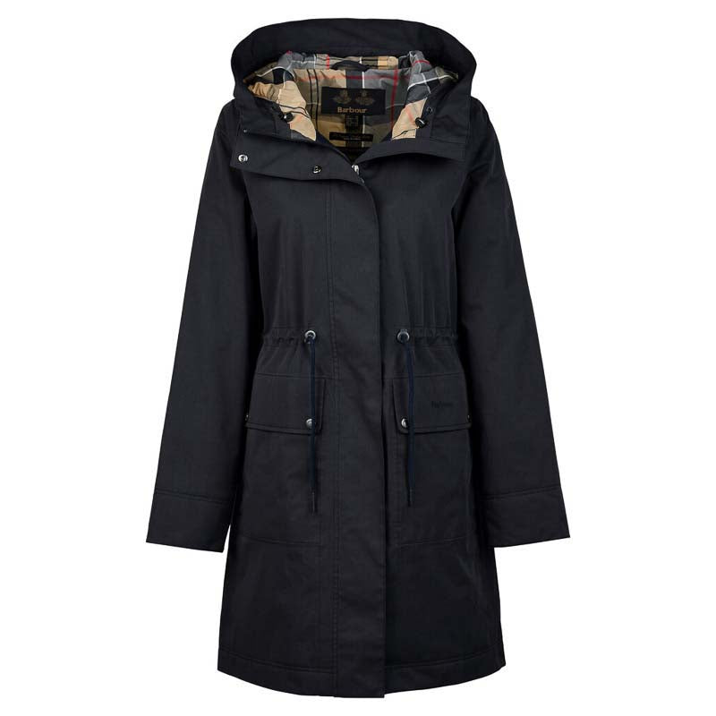 Stay dry and look stylish in this Barbour Bowlees Waterproof Ladies Jacket. This parka-style coat is crafted from a cotton blend that's waterproof, breathable, and adjustable with a drawcord at the waist. The snorkel tartan hood and high-low hem provide extra protection from the elements, while the patch pockets with stud fastening offer convenience.